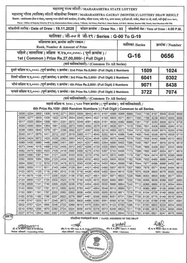 Maharashtra Gaurav Monthly Lottery Result 19.11.2025 0 Likes 72 Views Related Articles 0 75Maharashtra Padmini Weekly Draw Result 25.11.2025 0 32Maharashtra Sahyadri Prabhalaxmi Weekly Draw 20.12.2025 Result 4.30pm 0 55Maharashtra Sahyadri Rajlaxmi Weekly Draw 12.12.2025 Result 4.30pm 0 77Punjab State Dear 50 Chief Thursday 6pm Lottery Result 04.09.2025