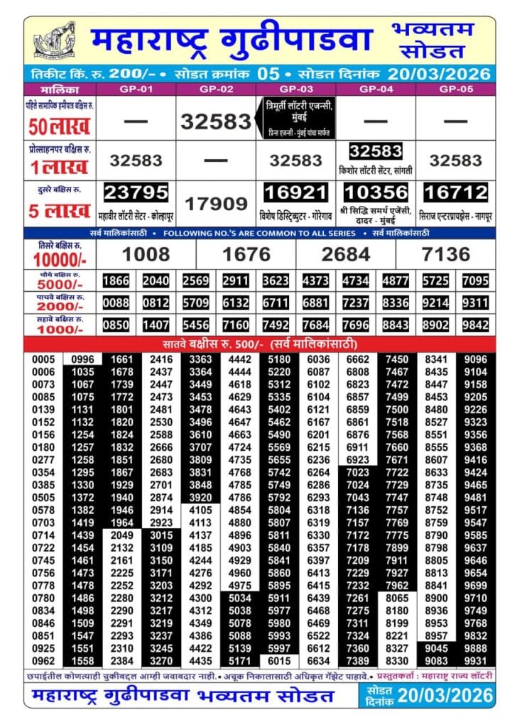 Maharashtra Gudhi Padva (Bumper) Draw Result 20.03.2026 0 Likes 62 Views Related Articles 0 23Maharashtra Sahyadri Dhanlaxmi Weekly Draw 23.03.2026 Result 4.30 PM 0 106Punjab State Dear 50 Beast Monday 6pm Lottery Result 17.11.2025 0 120Maharashtra Mohini Weekly Draw 16.11.2025 Result 4.30pm 0 88Golden 1000 Dhamaka Lottery 26.10.2025 Result 6.15pm