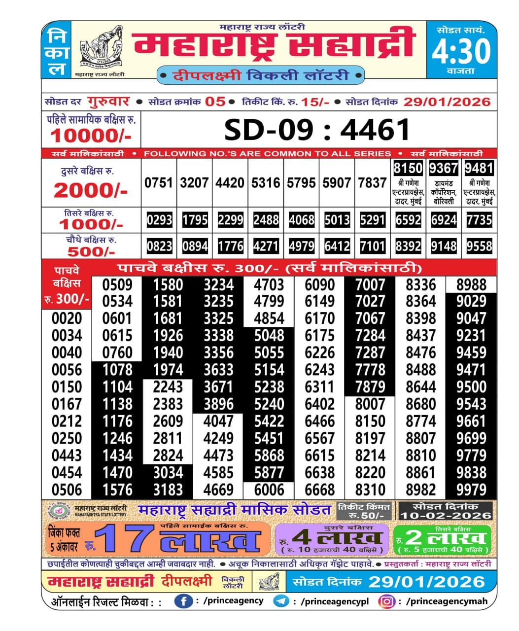 Maharashtra Laxmi Weekly Draw Result 08.11.2025 1 Likes 171 Views Related Articles 5 400Punjab state dear 200 monthly lottery 1.11.2025 at 6pm 0 93Maharashtra Gajlaxmi Som Weekly Draw Result 20.10.2025 0 31Rajshree 200 Monthly Lottery 19.2.2026 Result 6.30 PM 0 38Maharashtra Sahyadri Deeplaxmi Weekly Draw 29.01.3036 Result 4.30pm