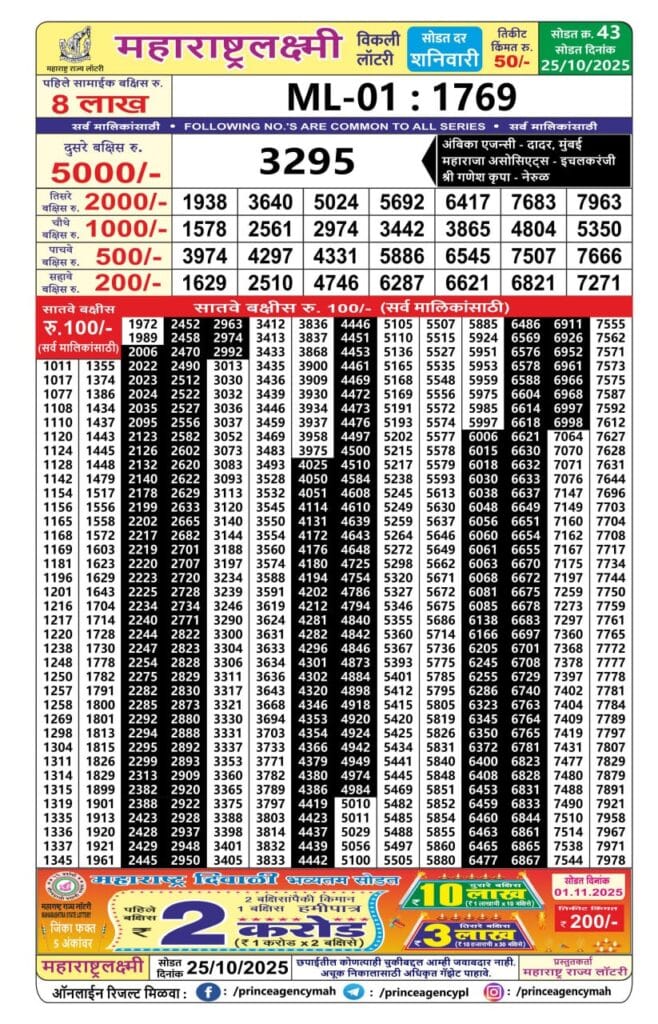 Maharashtra Laxmi Weekly Draw Result 25.10.2025 0 Likes 68 Views Related Articles 0 50Maharashtra Sagarlaxmi Weekly Draw Result 03.11.2025 0 41Punjab State Dear 50 Jackal Saturday 6pm Lottery Result 18.10.2025 0 81Golden Ganpati Bumper Lottery Result 01.09.2025 0 62Dear 50 ravi saturday Lottery 5pm Result 20.07.2025