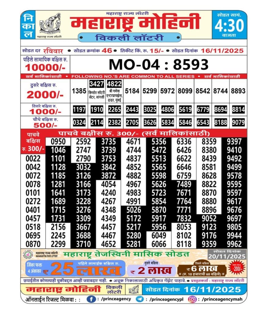Maharashtra Mohini Weekly Draw 16.11.2025 Result 4.30pm