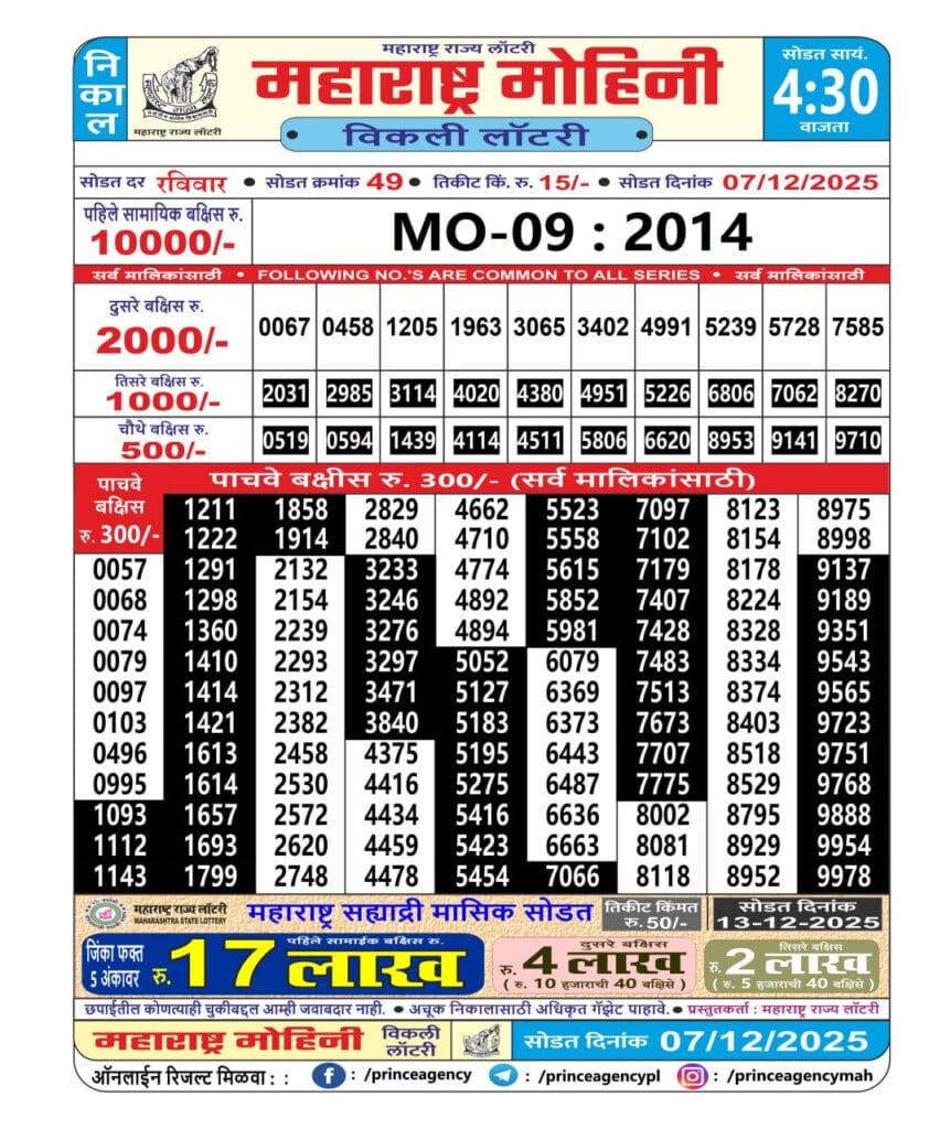 Maharashtra Mohini Weekly Draw 07.12.2025 Result 4.30pm 0 Likes 35 Views Related Articles 0 58Maharashtra Padmini Weekly Draw Result 22.07.2025 0 71Rajshree Guru Thursday Weekly Lottery 1PM Result 17.07.2025 0 39Maharashtra Ganeshlaxmi Natal Special (Monthly) Draw Result 19.12.2025 0 50Maharashtra Sahyadri Vijayalaxmi Weekly Draw 12.11.2025 Result 4.30pm