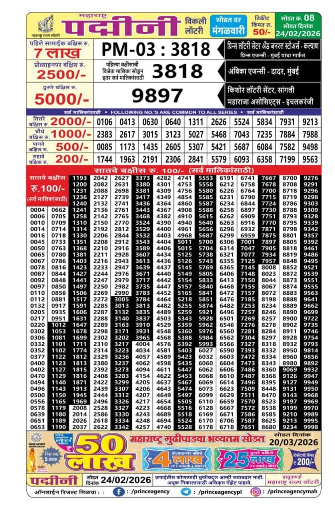 Maharashtra Padmini Weekly Draw Result 24.02.2026 0 Likes 109 Views Related Articles 0 9Rajshree Night Shani Weekly Lottery 04.04.2026 Result 9 PM 0 108Punjab State Dear 50 Colt Friday 6pm Lottery Result 14.11.2025 0 66Maharashtra Ganeshlaxmi Bhagyashali Weekly Draw 19.01.2026 Result 5pm 0 24Rajshree Marigold Weekly Lottery 30.03.2026 Result 4 PM