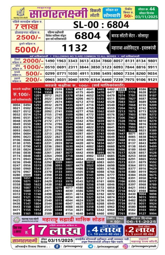 Maharashtra Sagarlaxmi Weekly Draw Result 03.11.2025 0 Likes 50 Views Related Articles 0 67Dear 100 beas tuesday Lottery 5pm Result 22.07.2025 3 143Mizoram state golden 100 gold monthly lottery 3.12.2025 at 6.30 pm 0 90Punjab state dear 50 monthly lottery 15-07-2025 at 6pm 0 63Rajshree mangal Weekly Lottery 1PM Result 22.07.2025