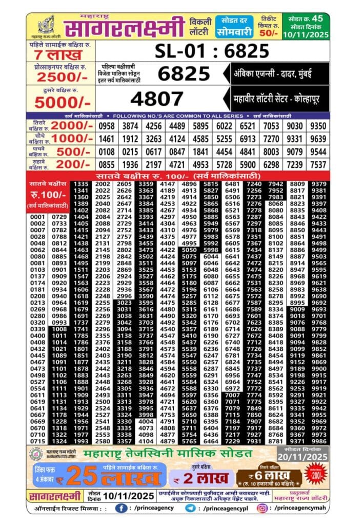Maharashtra Sagarlaxmi Weekly Draw Result 10.11.2025