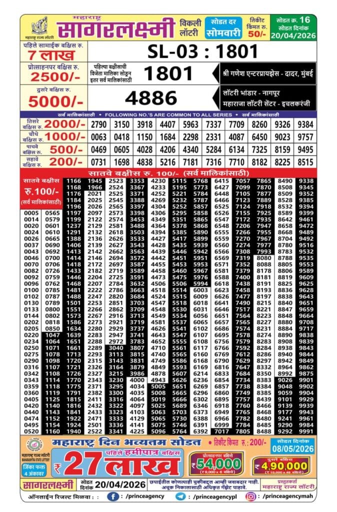Maharashtra Sagarlaxmi Weekly Draw Result 20.04.2026 0 Likes 7 Views Related Articles 0 40Rajshree 10 Evening Mangal Weekly Lottery 31.03.2026 Result 5.40 PM 0 53Rajshree 10 Evening Budh Weekly Lottery 01.04.2026 Result 5.40 PM 0 25Punjab State Dear 50 Jackal Saturday Weekly Lottery 18.04.2026 Result 5 PM 0 44Maharashtra Gajlaxmi Shani Weekly Draw 28.03.2026 Result 4.45 PM