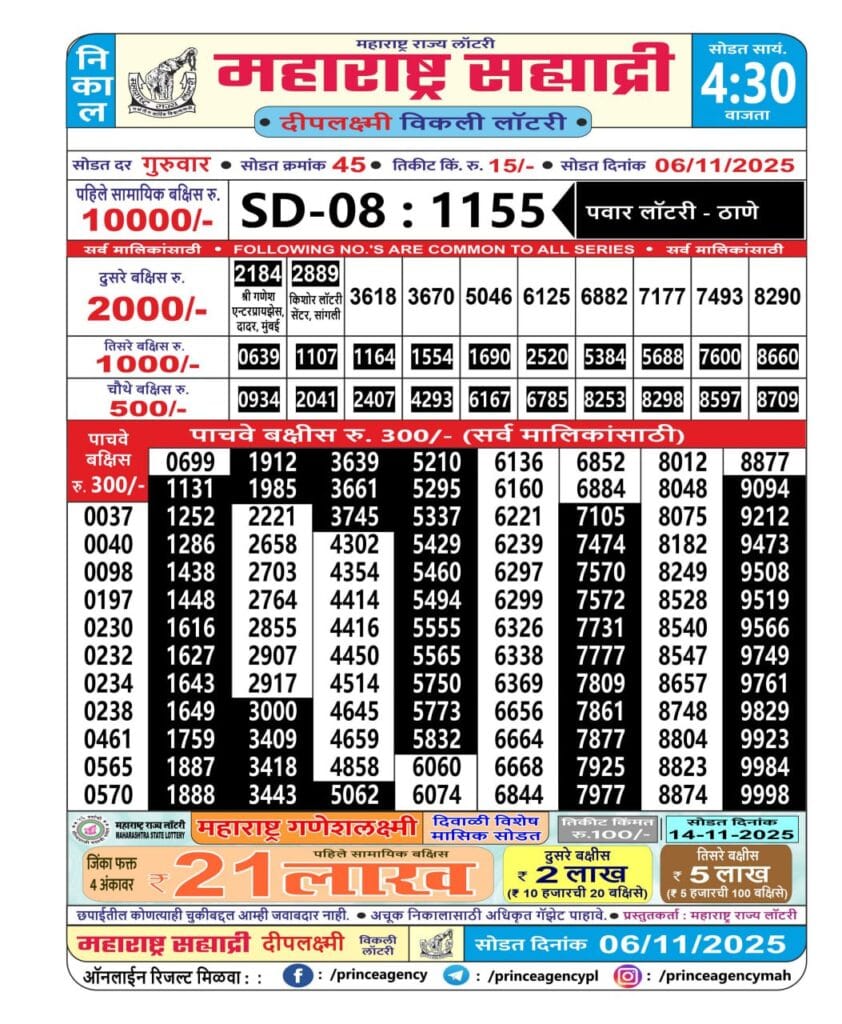 Maharashtra Sahyadri Deeplaxmi Weekly Draw 06.11.2025 at 4.30pm