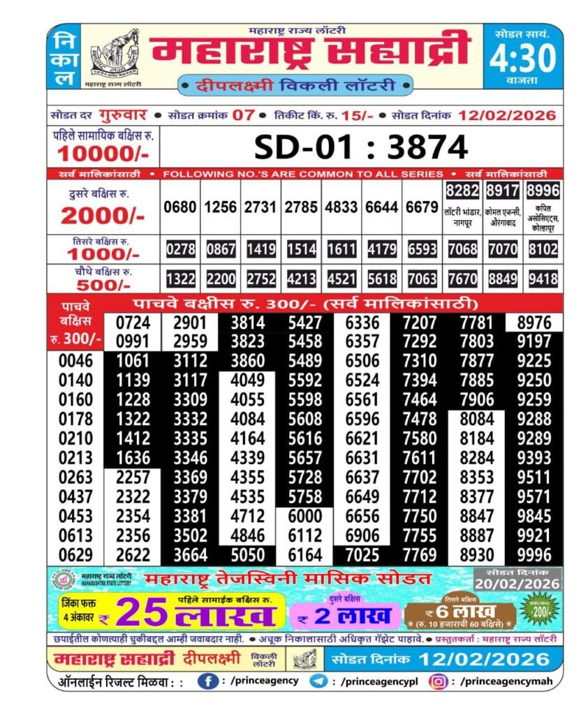 Maharashtra Sahyadri Deeplaxmi Weekly Draw 12.2.2026 Result 4.30pm 0 Likes 59 Views Related Articles 0 91Punjab State Dear 50 Buster Wednesday 6pm Lottery Result 29.10.2025 0 19Rajshree Som Weekly Lottery 16.2.2026 Result 2.25 PM 0 114Punjab State Dear 200 Monthly Lottery 3.1.2026 Result 6 PM 0 81Punjab State Dear 50 Beast Monday 6pm Lottery Result 27.10.2025