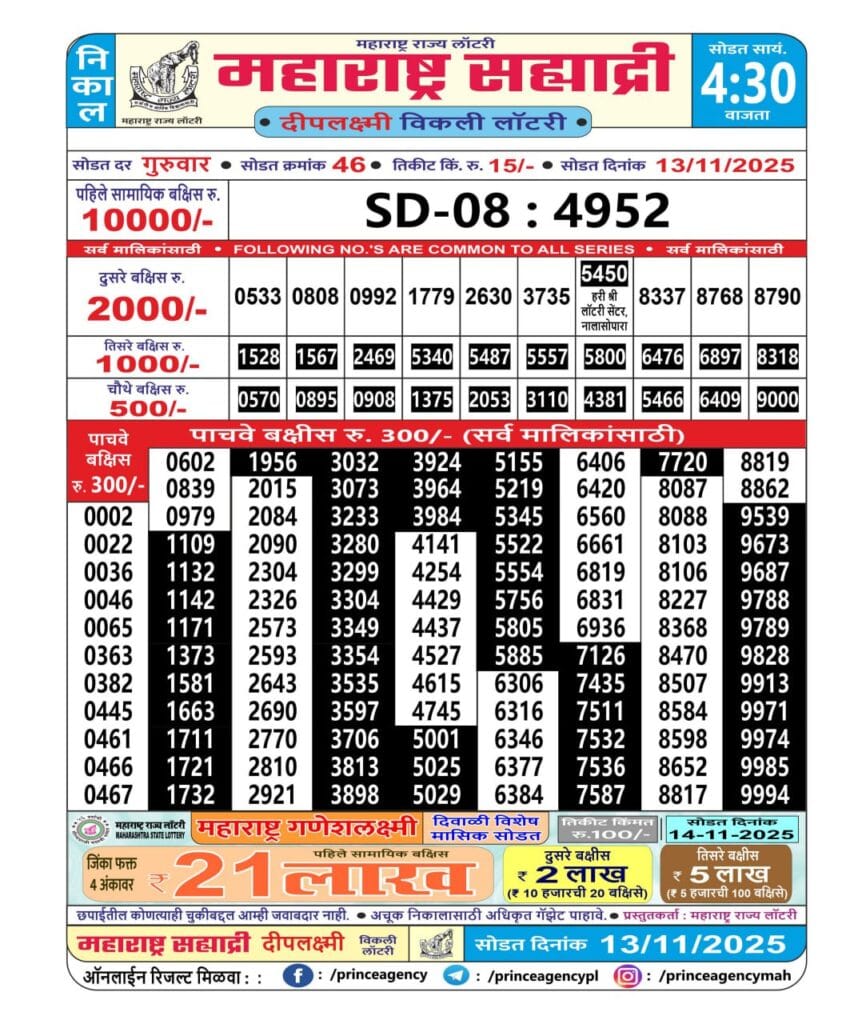 Maharashtra Sahyadri Deeplaxmi Weekly Draw 13.11.2025 Result 4.30pm 0 Likes 126 Views Related Articles 0 65Maharashtra Tejawini Monthly Draw Result 20.11.2025 0 99Rajshree 30 Lottery 8:30PM Daily Result 22 July 2025 0 5Rajshree 10 Evening Ravi Weekly Lottery 22.2.2026 Result 5.40 PM 0 33Golden Saturday Lotto India 9.30 PM Result 14.2.2026
