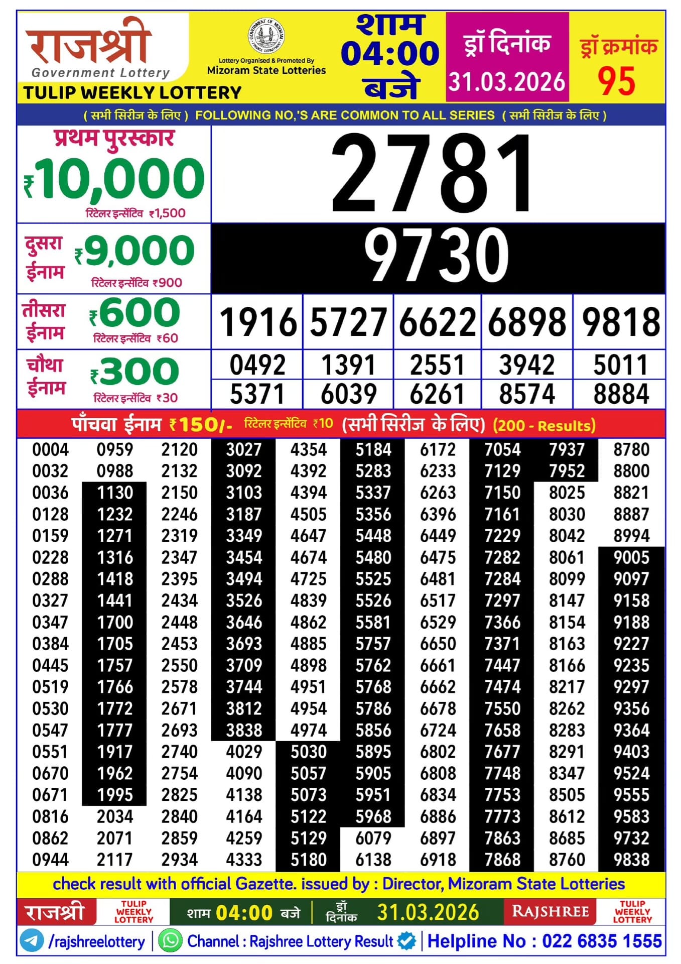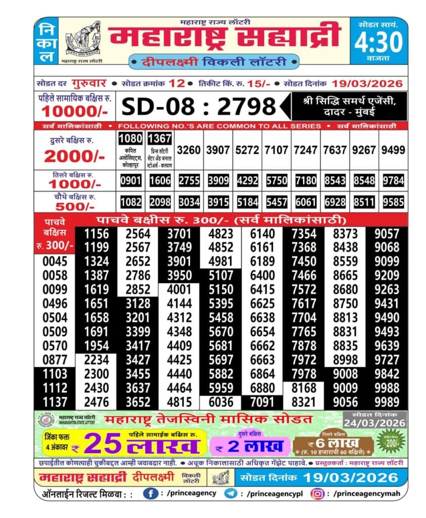 Maharashtra Sahyadri Deeplaxmi Weekly Draw 19.03.2026 Result 4.30 PM 0 Likes 77 Views Related Articles 0 11Rajshree 50 Shani Weekly Lottery 04.04.2026 Result 7.30 PM 0 143Maharashtra Ganeshlaxmi Shubh Weekly Draw 11.11.2025 Result 5pm 0 127Maharashtra Padmini Weekly Draw Result 18.11.2025 1 383Golden 250 Gold Monthly Lottery 28 January 2026 At 6.30 PM