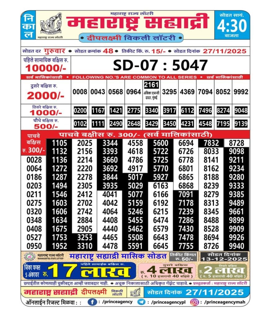 Maharashtra Sahyadri Deeplaxmi Weekly Draw 27.11.2025 Result 4.30pm 0 Likes 118 Views Related Articles 0 98Maharashtra Padmini Weekly Draw Result 22.07.2025 0 94Maharashtra Gajlaxmi Mangal Weekly Draw 09.12.2025 Result 4.45pm 0 86Maharashtra Ganeshlaxmi Samruddhi Weekly Draw 13.12.2025 Result 5pm 0 125Maharashtra Gajlaxmi Guru Weekly Draw 13.11.2025 Result 4.45pm