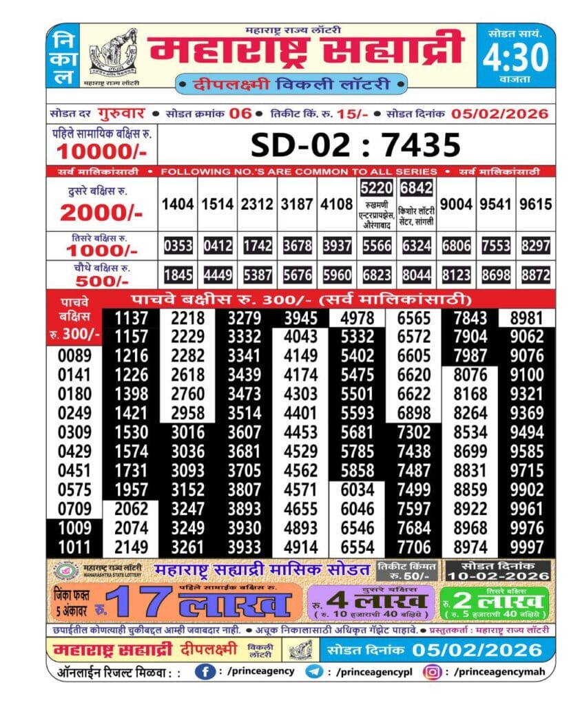 Maharashtra Sahyadri Deeplaxmi Weekly Draw 5.2.2026 Result 4.30pm 0 Likes 63 Views Related Articles 0 49Golden Star Guru Weekly Lottery 08.01.2026 Result 9 PM 0 32Maharashtra Akarshak Pushkaraj Weekly Draw Result 12.2.2026 0 32Golden Star Ravi Weekly Lottery 31.01.2026 Result 9pm 0 69Maharashtra Gajlaxmi Shukra Weekly Draw 16.01.2026 Result 4.45pm