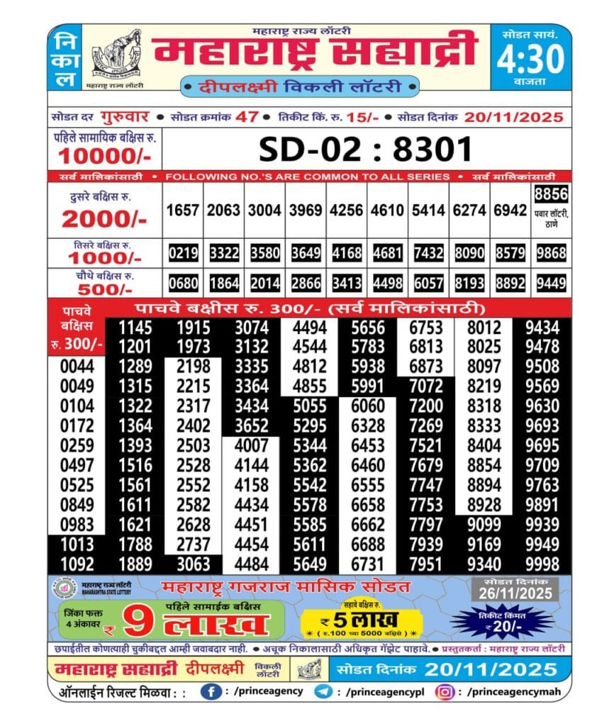 Maharashtra Sahyadri Deeplaxmi Weekly Draw 20.11.2025 Result 4.30pm 0 Likes 62 Views Related Articles 0 24Maharashtra Ganeshlaxmi Vaibhav Weekly Lottery Draw 21.12.2025 Result 4.30pm 0 44Punjab State Dear 50 Chief Thursday 6pm Lottery Result 23.10.2025 0 53Maharashtra Sahyadri Dhanlaxmi Weekly Draw 01.12.2025 Result 4.30pm 0 54Maharashtra Gajlaxmi Mangal Weekly Draw 18.11.2025 Result 4.45pm