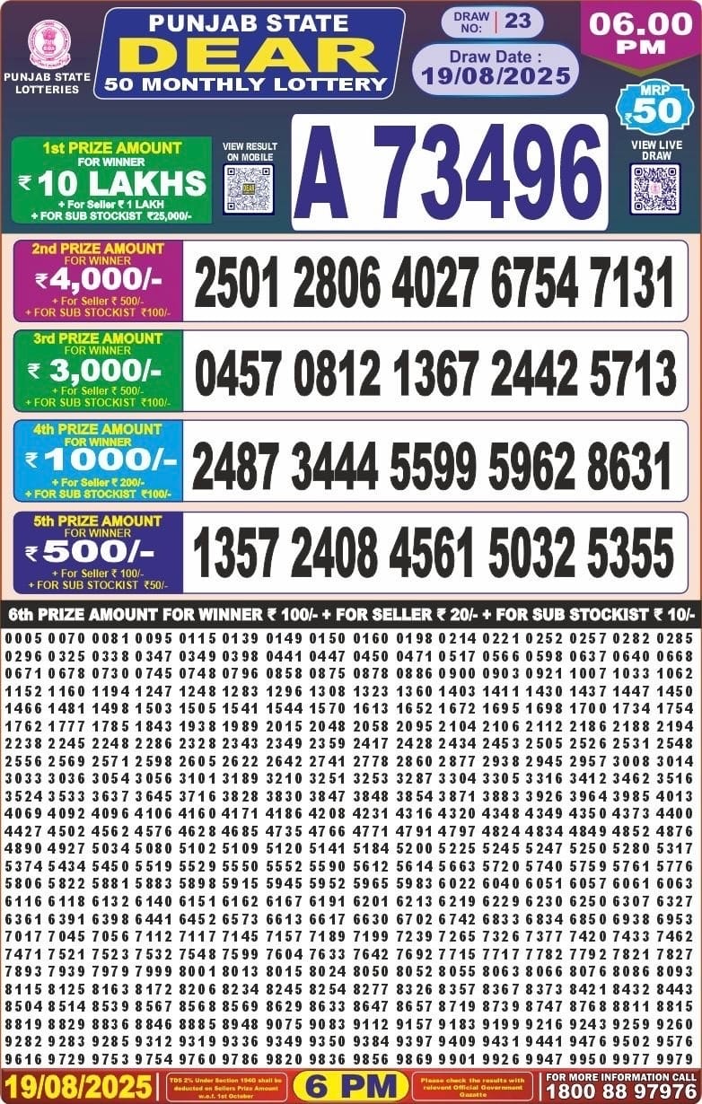 Maharashtra Sahyadri Dhanlaxmi Weekly Draw 01.12.2025 Result 4.30pm 0 Likes 53 Views Related Articles 0 45Dear 10 green lottery 1.30PM Result 22.07.2025 0 60Maharashtra Sahyadri Mahalaxmi Weekly Draw 22.07.2025 Result 4.30pm 0 64Nagaland State Dear Special Bumper 2025 Lottery 0 85Punjab State Dear 50 Monthly Lottery 19.8.2025 Result 6PM
