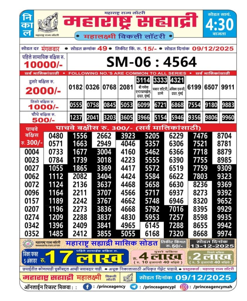Maharashtra Sahyadri Mahalaxmi Weekly Draw 09.12.2025 Result 4.30pm