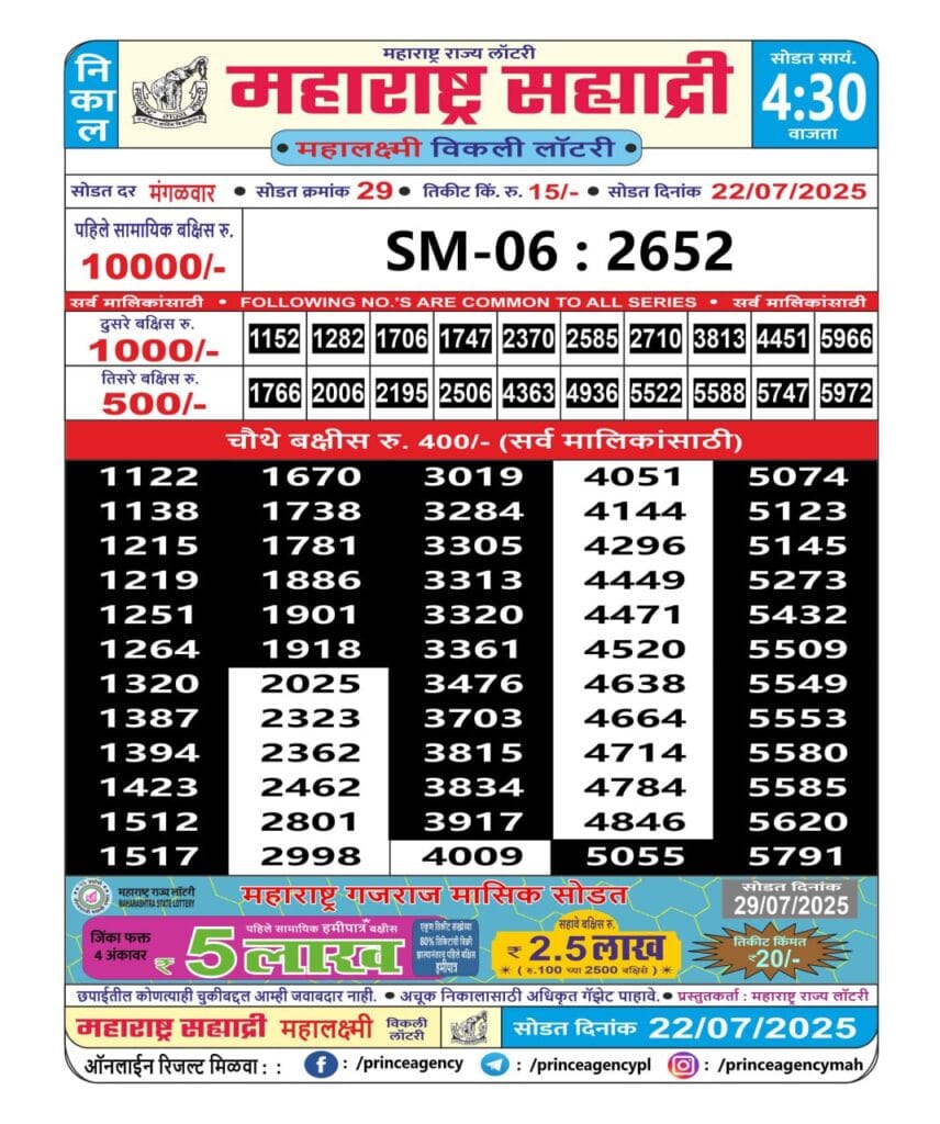 Maharashtra Sahyadri Mahalaxmi Weekly Draw 22.07.2025 Result 4.30pm 0 Likes 61 Views Related Articles 0 55Goa State Rajshree 250 Monthly Lottery 2 December 2025 At 6.30 PM 0 48Punjab state dear 200 monthly lottery 6pm result 6.12.2025 0 49Maharashtra Sagarlaxmi Weekly Draw Result 08.12.2025 0 28Punjab State Dear 50 Beast Monday 6pm Lottery Result 22.12.2025