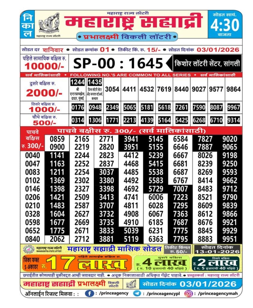 Maharashtra Sahyadri Prabhalaxmi Weekly Draw 03.01.2026 Result 4.30 PM 0 Likes 102 Views Related Articles 1 130Punjab state dear 200 monthly lottery 4 October 2025 At 8 PM 0 81Punjab State Dear 50 Colt Friday 6pm Lottery Result 28.11.2025 0 45Golden Star Mangal Weekly Lottery 10.02.2026 Result 7 PM 0 62Maharashtra Ganeshlaxmi Gaurav Weekly Draw 29.01.2026 Result 5pm