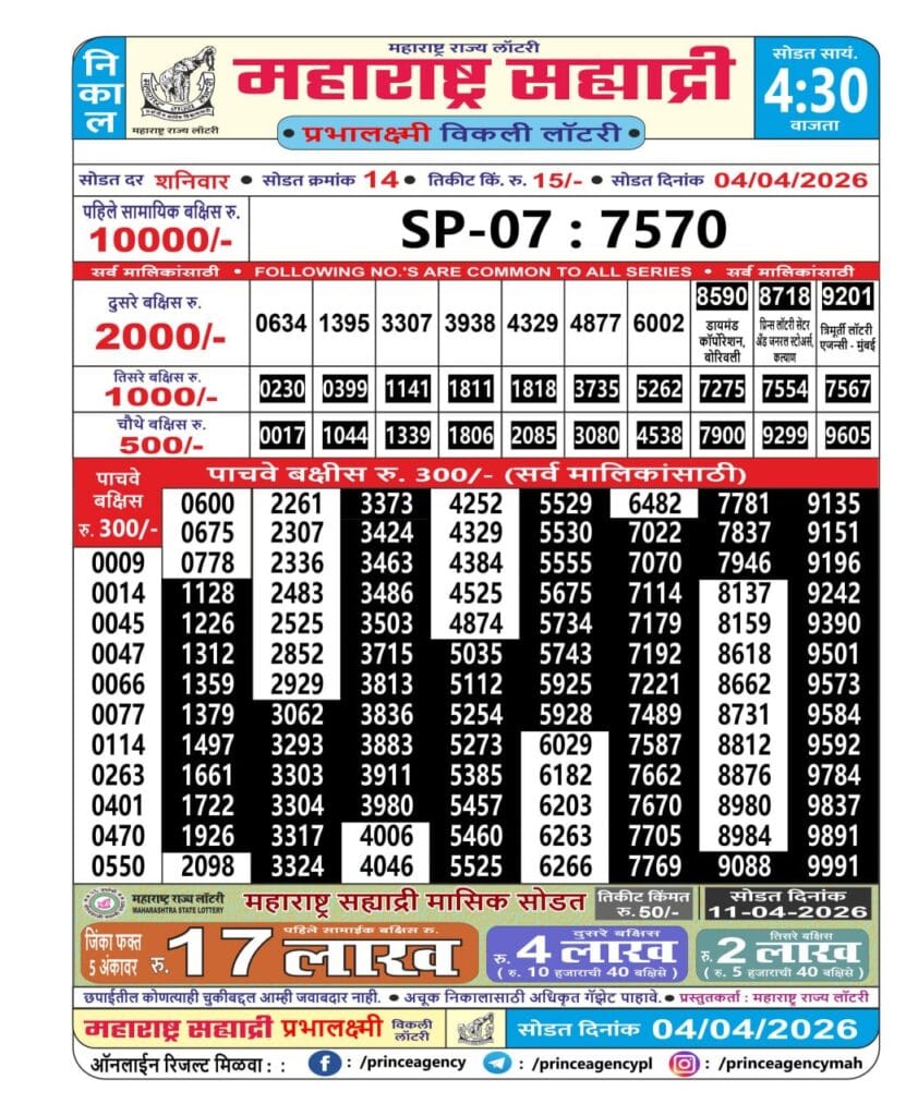 Maharashtra Sahyadri Prabhalaxmi Weekly Draw 04.04.2026 Result 4.30 PM 0 Likes 14 Views Related Articles 0 58Golden Star Shukra Weekly Lottery 30.01.2026 Result 9pm 0 121Maharashtralaxmi Weekly Draw Result 29.11.2025 1 110Goa State Rajshree 200 Monthly Lottery 19.2.2026 At 6.30 PM 0 91Maharashtra Gajlaxmi Shukra Weekly Draw 16.01.2026 Result 4.45pm