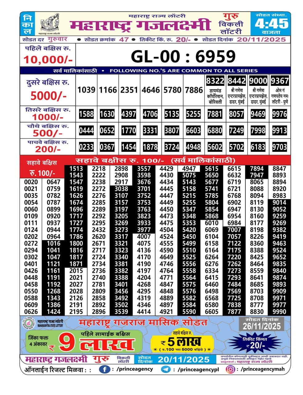 Maharashtra Sahyadri Prabhalaxmi Weekly Draw 08.11.2025 Result 4.30pm 0 Likes 53 Views Related Articles 0 54Maharashtra Sagarlaxmi Weekly Draw Result 17.11.2025 1 81Punjab State Dear 50 Colt Friday 6pm Lottery Result 05.09.2025 0 58Maharashtra Gajlaxmi Guru Weekly Draw 04.12.2025 Result 4.45pm 0 71Maharashtra Gajlaxmi Guru Draw 20.11.2025 Result 4.45pm