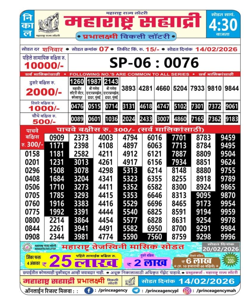 Maharashtra Sahyadri Prabhalaxmi Weekly Draw 14.02.2026 Result 4.30 PM 0 Likes 38 Views Related Articles 0 120Maharashtra Gajlaxmi Guru Weekly Draw 27.11.2025 Result 4.45pm 0 88Punjab State Dear 50 Colt Friday 6pm Lottery Result 29.08.2025 0 74Punjab State Dear 100 Monthly Lottery 13.1.2026 At 7 PM 0 98Maharashtra Sahyadri Rajlaxmi Weekly Draw Result 05.12.2025