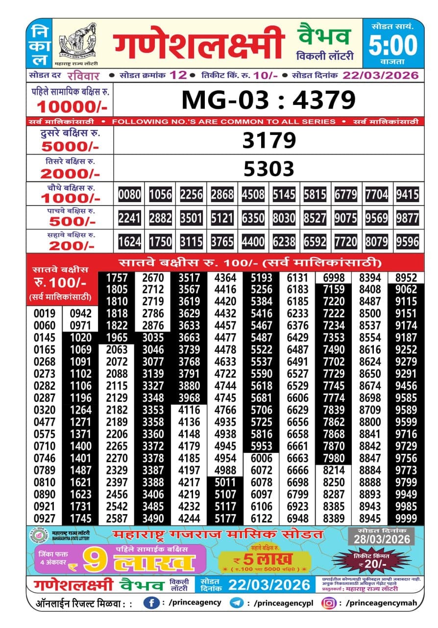 Maharashtra Sahyadri Prabhalaxmi Weekly Draw 7.2.2026 Result 4.30 PM 0 Likes 94 Views Related Articles 0 27Rajshree Marigold Weekly Lottery 06.04.2026 Result 4 PM 0 63Maharashtra Sahyadri Dhanlaxmi Weekly Draw 02.02.2026 Result 4.30pm 0 64Maharashtra Ganeshlaxmi Vaibhav Weekly Draw 22.03.2026 Result 5 PM 4 169Goa state rajshree 50 monthly lottery 26 march 2026 at 6.30pm onwards