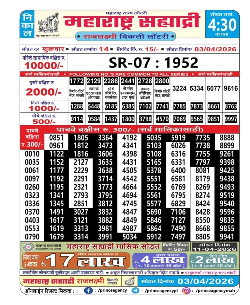 Maharashtra Sahyadri Rajlaxmi Weekly Draw 03.04.2026 Result 4.30 PM