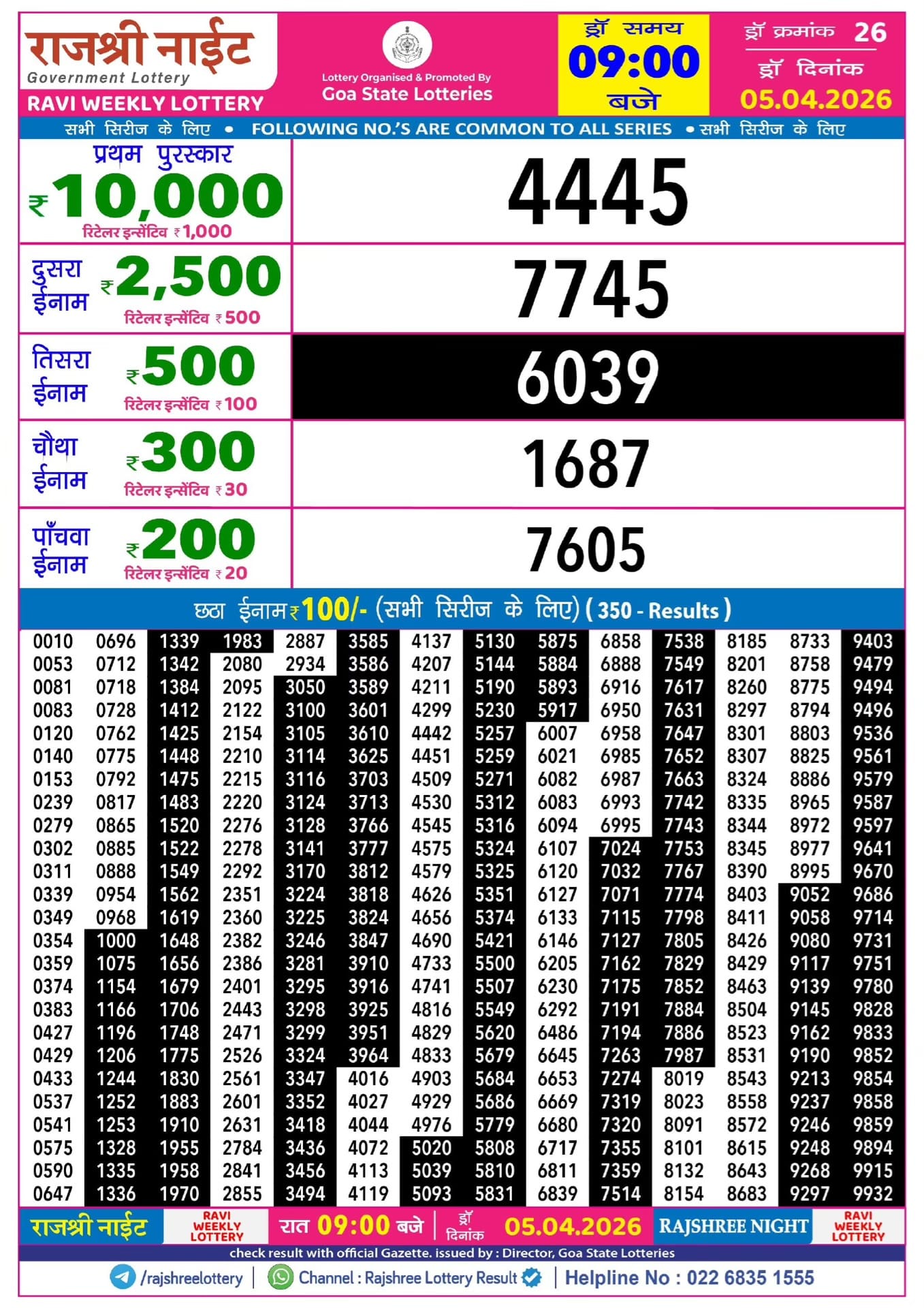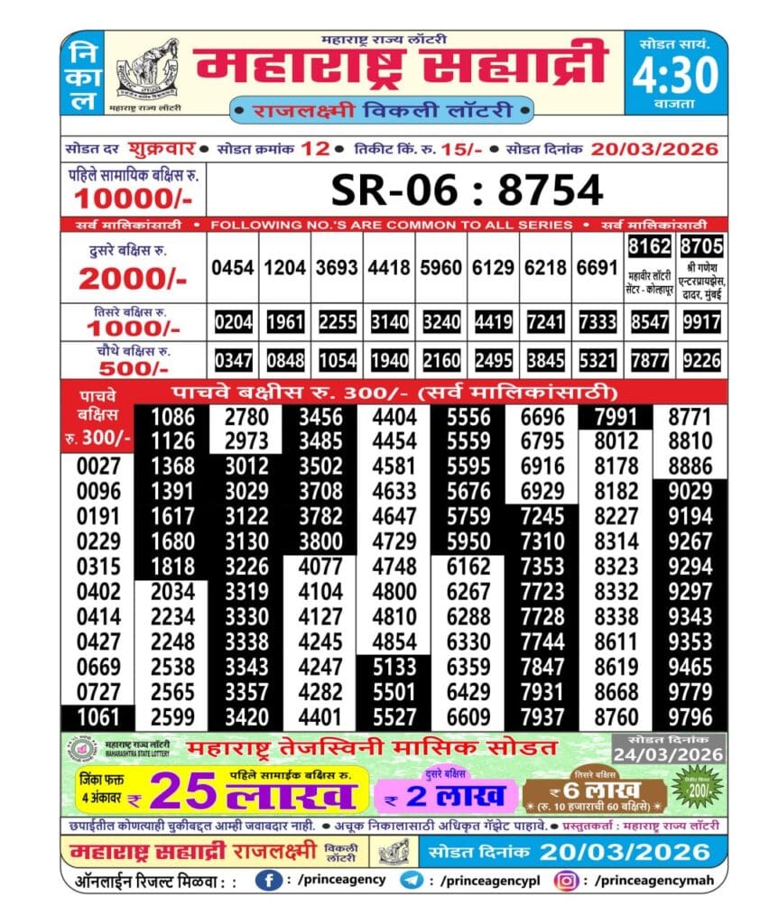 Maharashtra Sahyadri Rajlaxmi Weekly Draw 20.03.2026 Result 4.30 PM 0 Likes 78 Views Related Articles 0 91Goa State Rajshree 200 Monthly Lottery 19 March 2026 At 6.30 PM (Gudipadwa Special) 1 72Rajshree 50 Mangal Weekly Lottery 03.03.2026 Result 7.30 PM 0 191Maharashtra Laxmi Weekly Draw Result 24.01.2026 0 73Maharashtra Sahyadri Deeplaxmi Weekly Draw 19.02.2026 Result 4.30 PM