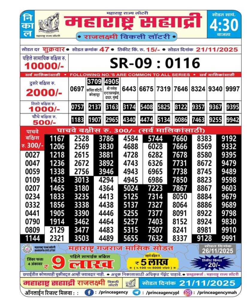 Maharashtra Sahyadri Rajlaxmi Weekly Draw 21.11.2025 Result 4.30pm 0 Likes 58 Views Related Articles 0 95Punjab state dear 100 monthly lottery 12.8.2025 At 6 PM 0 54Maharashtra Gajlaxmi Shukra Weekly Draw 21.11.2025 Result 4.45pm 0 67Maharashtra Ganeshlaxmi Gaurav Weekly Draw 23.10.2025 Result 5pm 0 75Punjab state dear 50 monthly lottery 15.07.2025 result 6pm
