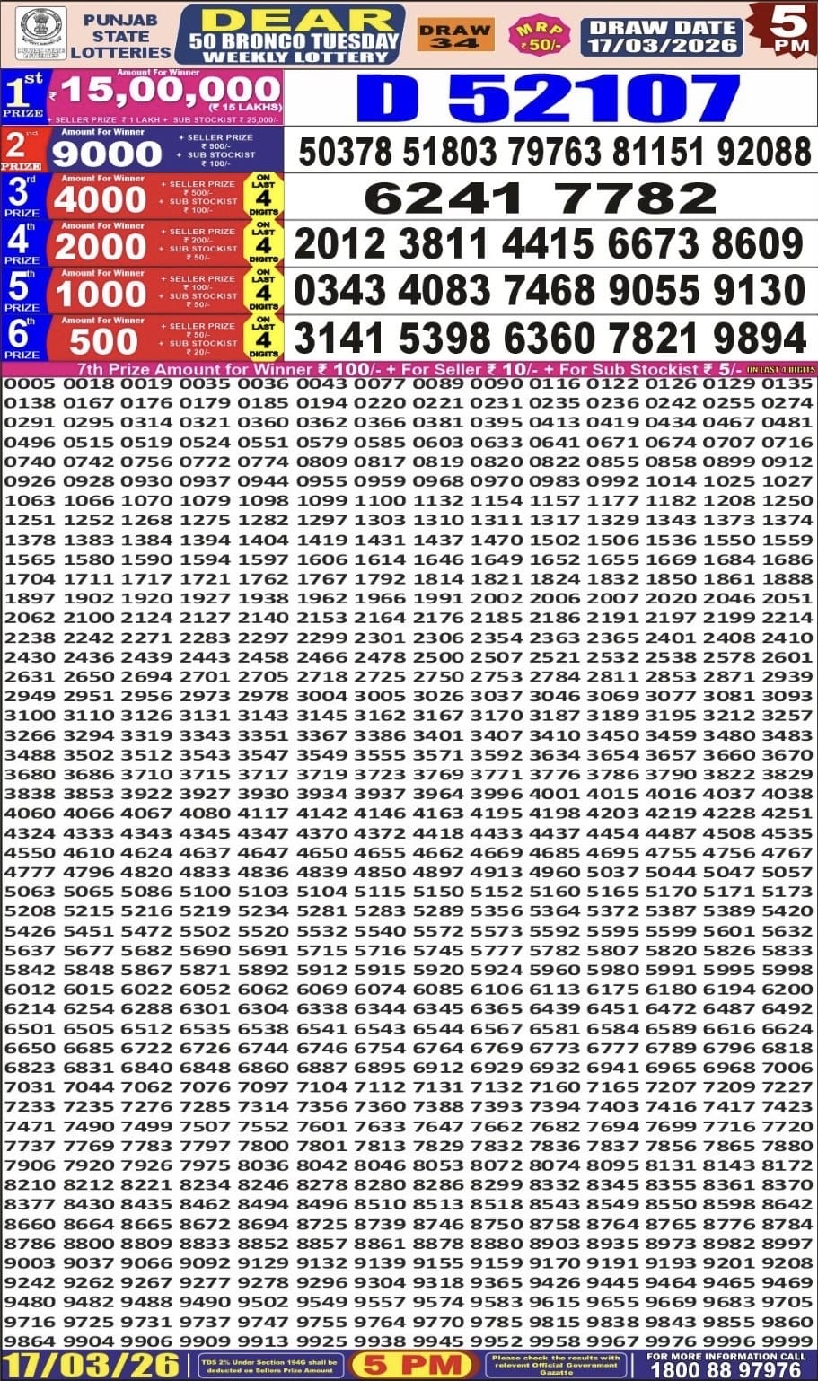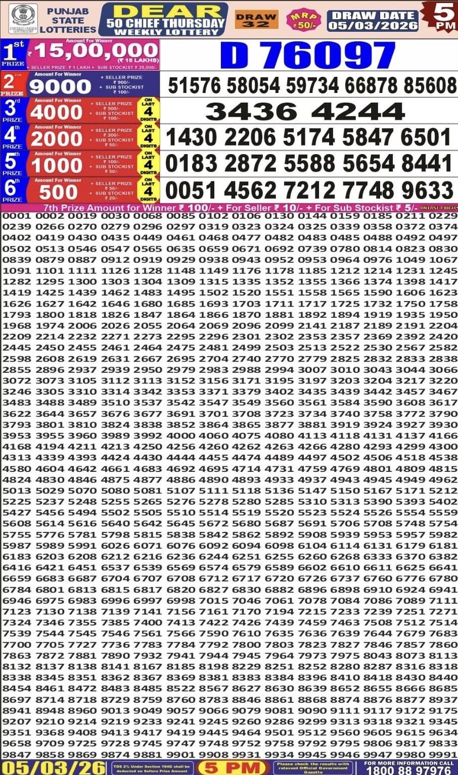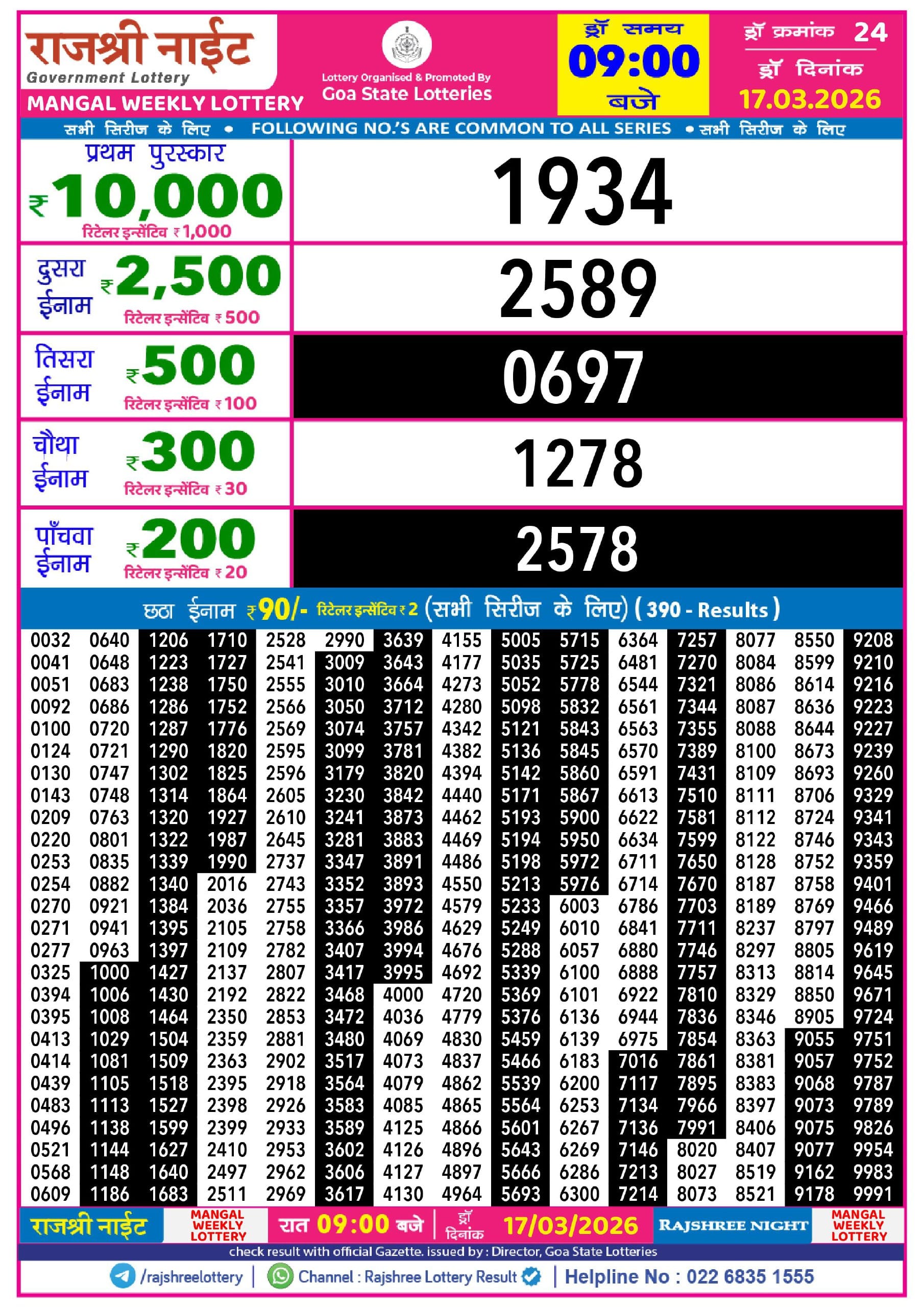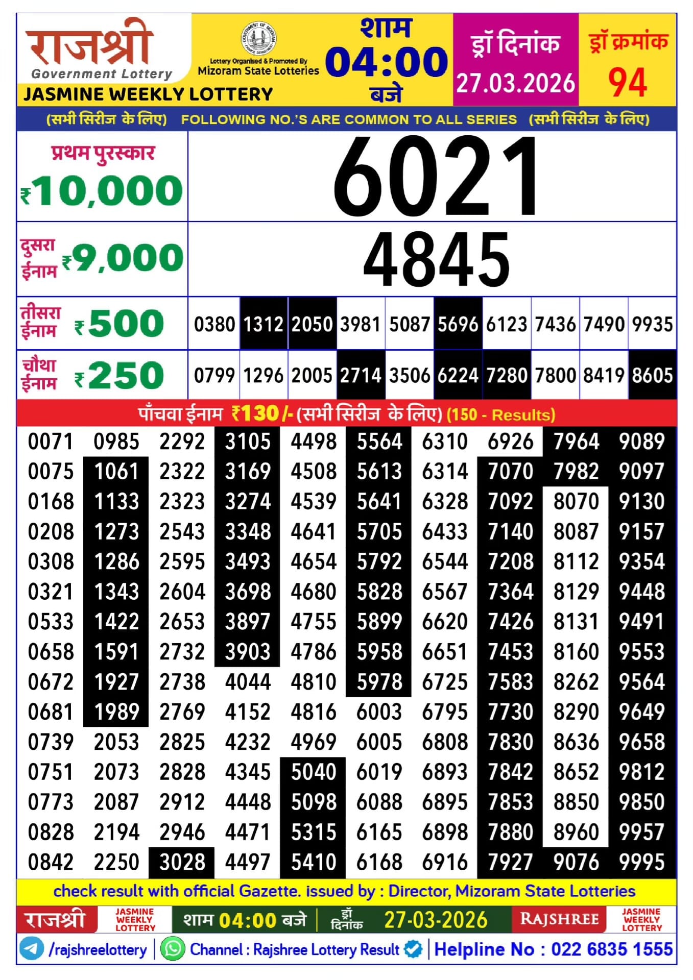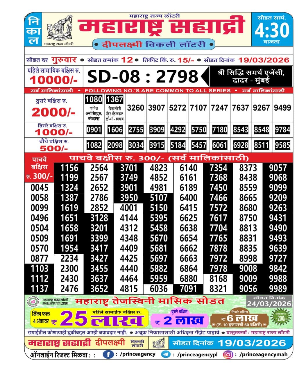 Maharashtra Sahyadri Vijayalaxmi Weekly Draw 01.04.2026 Result 4.30 PM 0 Likes 40 Views Related Articles 0 52Rajshree Night Mangal Weekly Lottery 17.03.2026 Result 9 PM 0 76Maharashtra Sahyadri Deeplaxmi Weekly Draw 19.03.2026 Result 4.30 PM 0 136Mizoram state golden 500 gold monthly lottery 9 July 2025 at 6.30pm 0 98Punjab State Dear 50 Buster Wednesday 6pm Lottery Result 05.11.2025