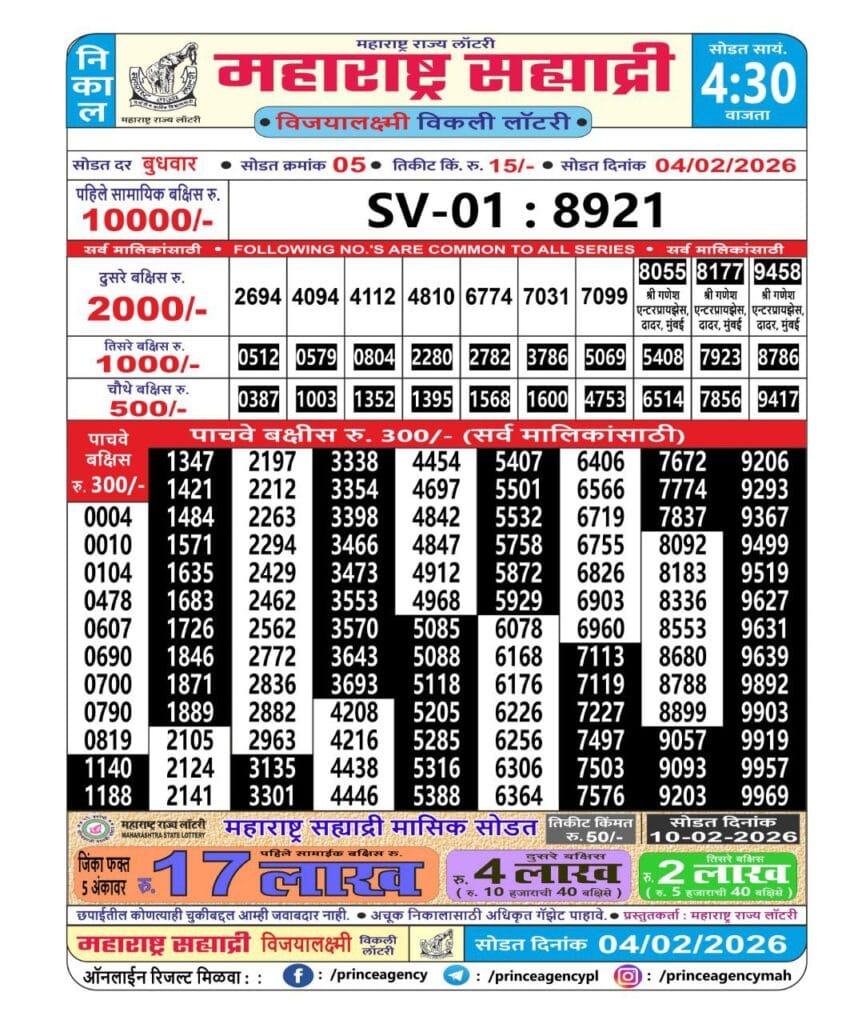 Maharashtra Sahyadri Vijaylaxmi Weekly Draw 4.2.2026 Result 4.30pm 0 Likes 42 Views Related Articles 0 27Rajshree Night Shani Weekly Lottery 14.02.2026 Result 9 PM 0 94Punjab State Dear 50 Chief Thursday 6pm Lottery Result 18.12.2025 0 104Nagaland State Dear 2000 Monthly Lottery 9 August 2025 At 8 PM 0 31Rajshree Night Mangal Weekly Lottery 17.2.2026 Result 9 PM