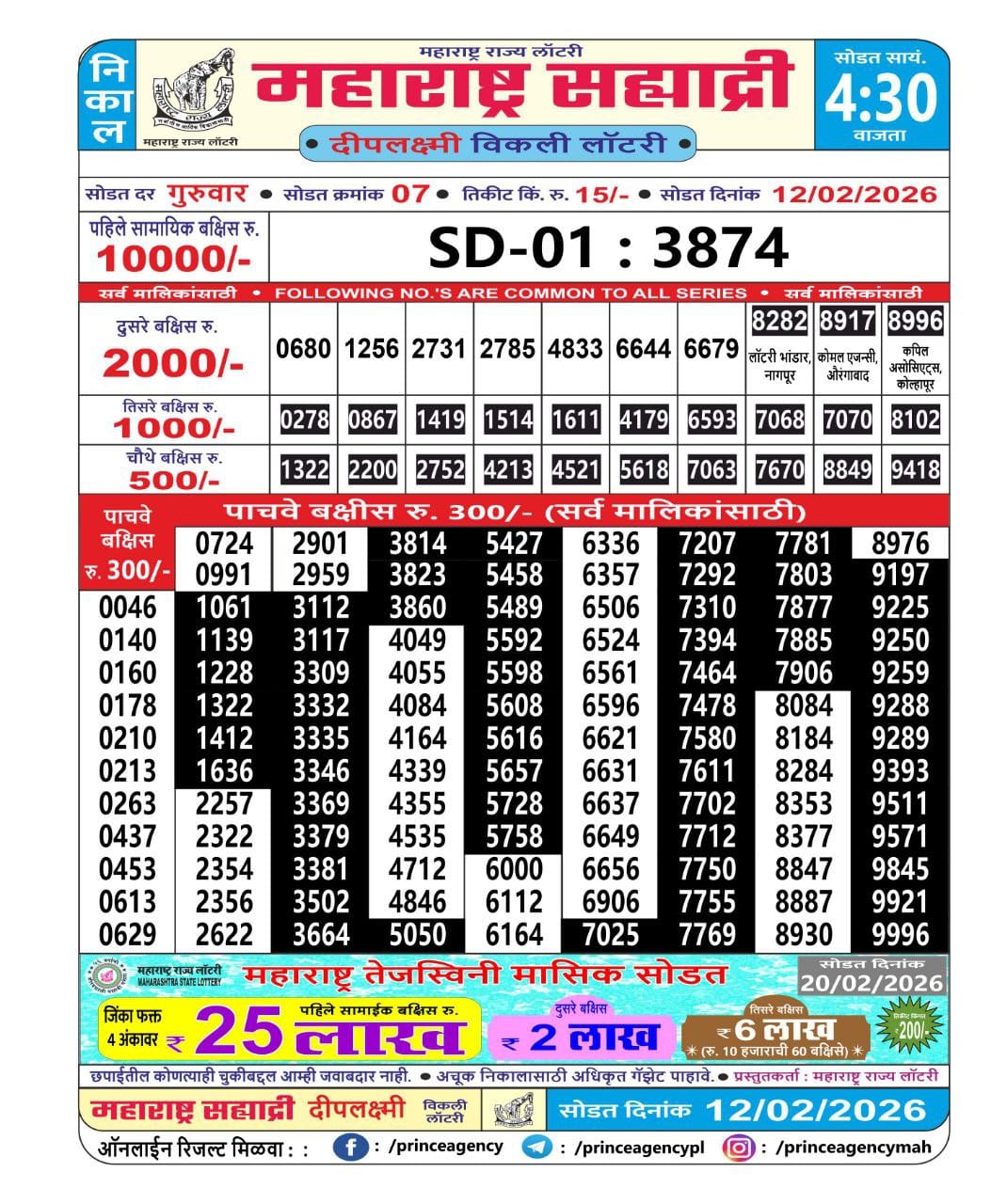 Maharashtra Tejaswini Monthly Draw Result 24.12.2025 0 Likes 84 Views Related Articles 0 110Maharashtra Akshay Weekly Draw Result 17.12.2025 0 20Rajshree Tuesday Weekly Lottery 17.2.2026 Result 8 PM 0 59Maharashtra Sahyadri Deeplaxmi Weekly Draw 12.2.2026 Result 4.30pm 0 135(7 Crore) Punjab State Dear Rakhi Bumper 2025