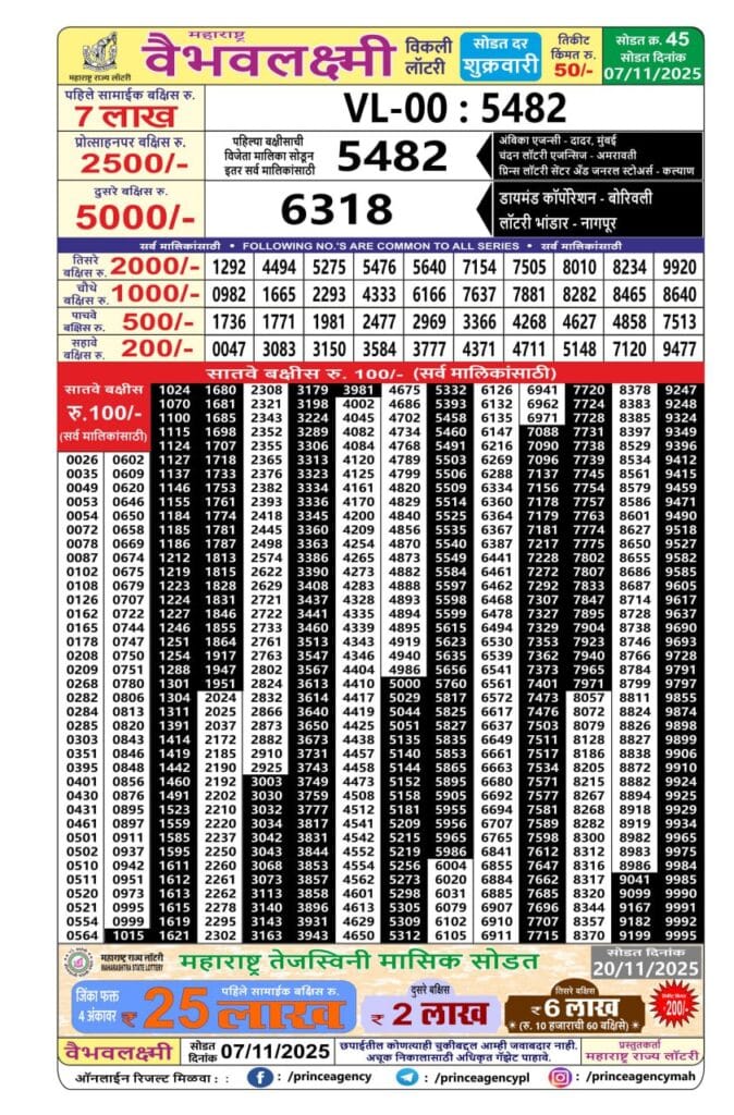 Maharashtra Vaibhavlaxmi Weekly Draw Result 07.11.2025 0 Likes 43 Views Related Articles 0 55Maharashtra Gajlaxmi Ravi Weekly Draw 23.11.2025 Result 4.45pm 0 48Punjab state dear 200 monthly lottery 6pm result 6.12.2025 0 53Rajshree 30 Lottery 8:30PM Result 20.07.2025 0 71Maharashtra Gajlaxmi Guru Weekly Draw 23.10.2025 Result 4.45pm