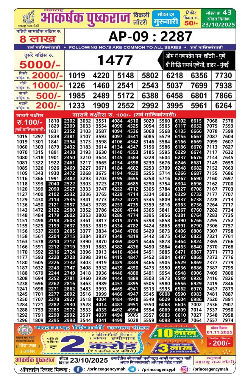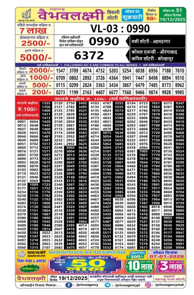 Maharashtra Vaibhavlaxmi Weekly Draw Result 19.12.2025 0 Likes 40 Views Related Articles 0 73Maharashtra Gajlaxmi Guru Weekly Draw 24.07.2025 Result 4.45pm 0 46Maharashtralaxmi Weekly Draw Result 29.11.2025 0 39Rajshree 500 monthly lottery 9.12.2025 at 6.30pm 0 61Dear finch Weekly Lottery 8PM Result 21.07.2025