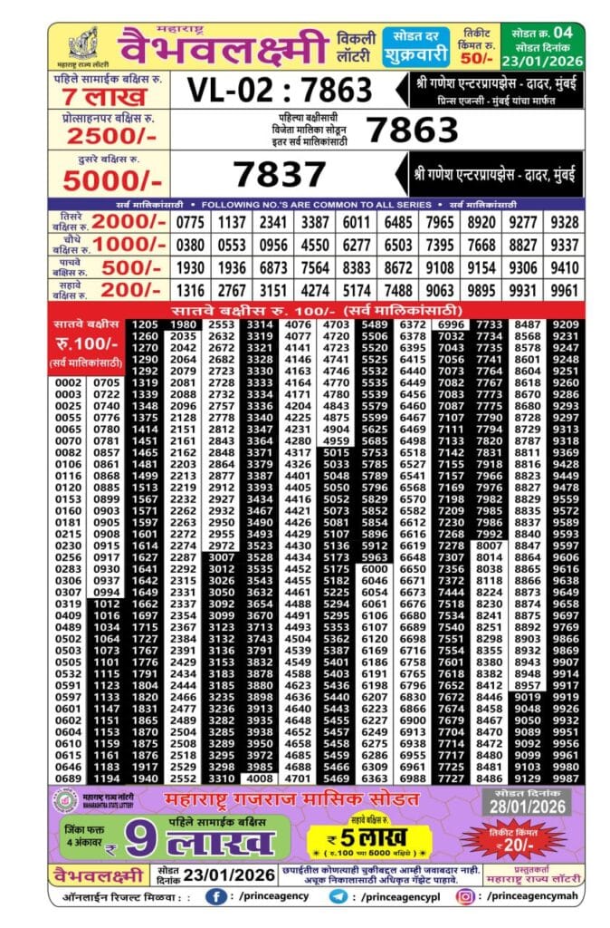 Maharashtra Vaibhavlaxmi Weekly Draw Result 23.01.2026 0 Likes 62 Views Related Articles 0 49Punjab State Dear 50 Ranger Sunday Weekly Lottery 8.2.2026 Result 5 PM 0 79Punjab state dear 100 monthly lottery 13.1.2026 at 7pm 1 114Golden 100 Gold Monthly Lottery 06.08.2025 Result 6.30pm 0 100Maharashtra Padmini Weekly Draw Result 18.11.2025