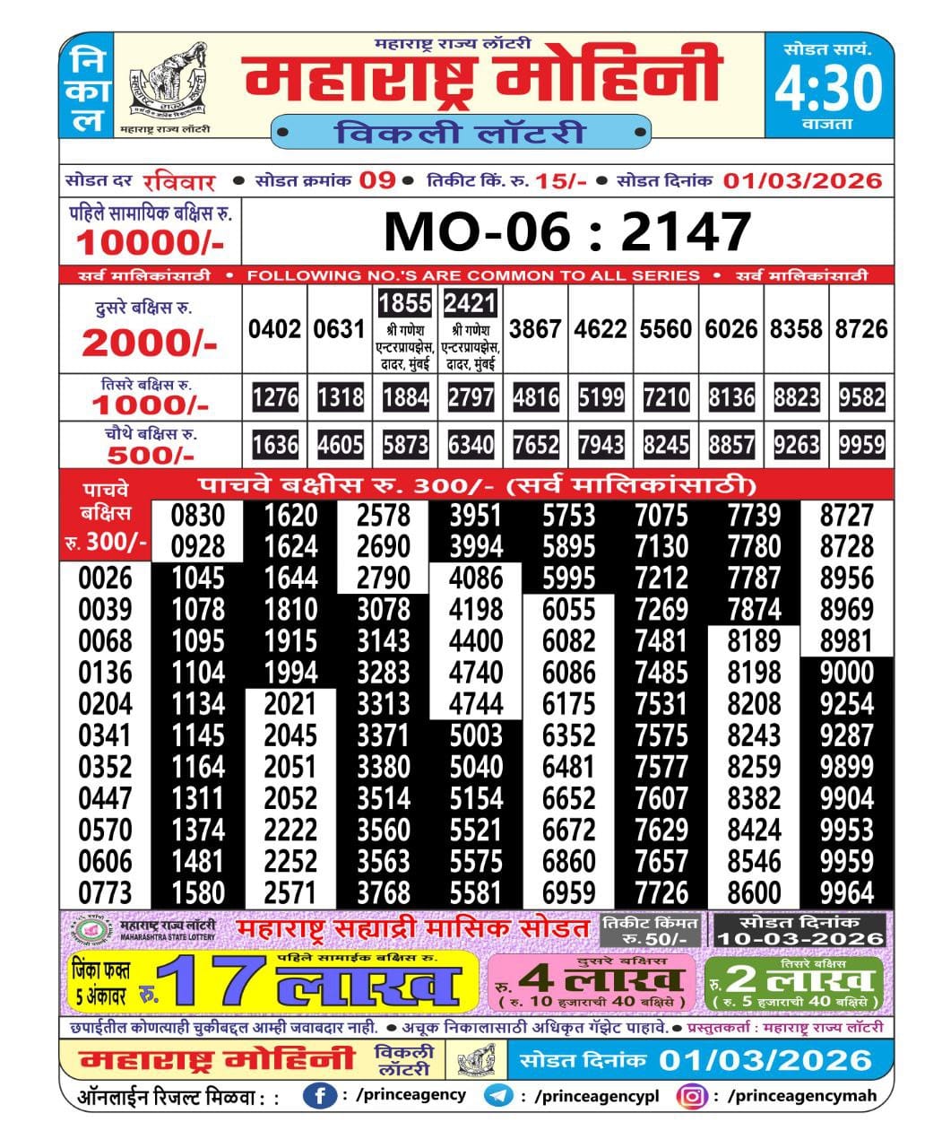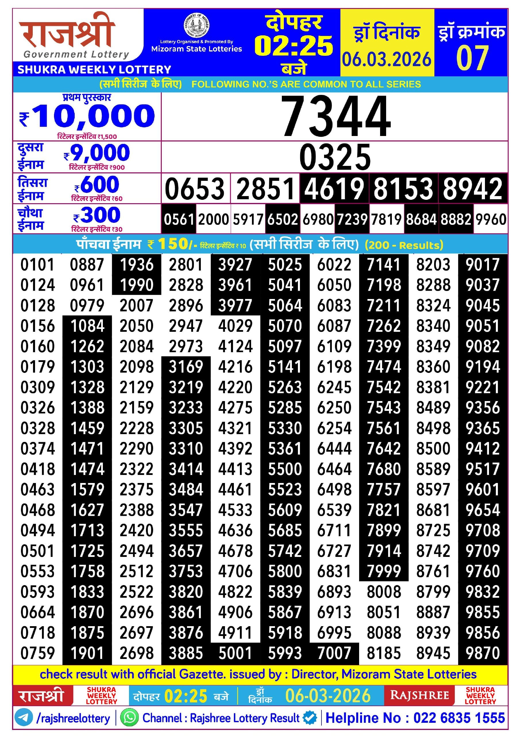 Maharashtra Vaibhavlaxmi Weekly Draw Result 27.03.2026 0 Likes 58 Views Related Articles 0 90Goa State Rajshree 200 Monthly Lottery 19 March 2026 At 6.30 PM (Gudipadwa Special) 0 46Rajshree Shukra Weekly Lottery 06.03.2026 Result 2.25 PM 0 77Kerala Christmas New Year Bumper 24.1.2026 Result 2 PM 0 28Rajshree 10 Evening Ravi Weekly Lottery 29.03.2026 Result 5.40 PM