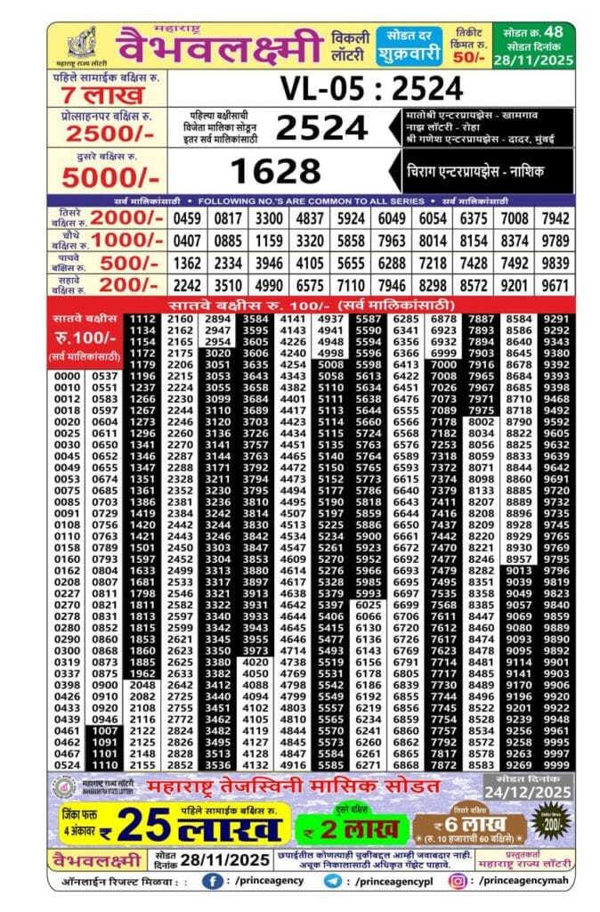 Maharashtra Vaibhavlaxmi Weekly Draw Result 28.11.2025 0 Likes 75 Views Related Articles 0 97Punjab state dear 50 Jackal Saturday Weekly Lottery 2.8.2025 Result 6pm 0 53Maharashtra Ganeshlaxmi Bhagyashali Weekly Draw 01.12.2025 Result 5pm 0 57Punjab State Dear 50 Chief Thursday 6pm Lottery Result 16.10.2025 0 49Punjab State Dear 50 Chief Thursday 6pm Lottery Result 04.12.2025