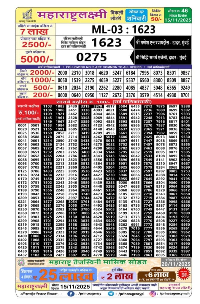 Maharashtralaxmi Weekly Draw Result 15.11.2025 0 Likes 123 Views Related Articles 0 144Punjab State 200 Monthly Lottery Result 05.07.2025 0 65Maharashtra Padmini Weekly Draw Result 13.01.2026 0 50Punjab state dear 1000 quarterly lottery 10.1.2026 At 7 PM 0 81Punjab State Dear 50 Beast Monday 6pm Lottery Result 27.10.2025