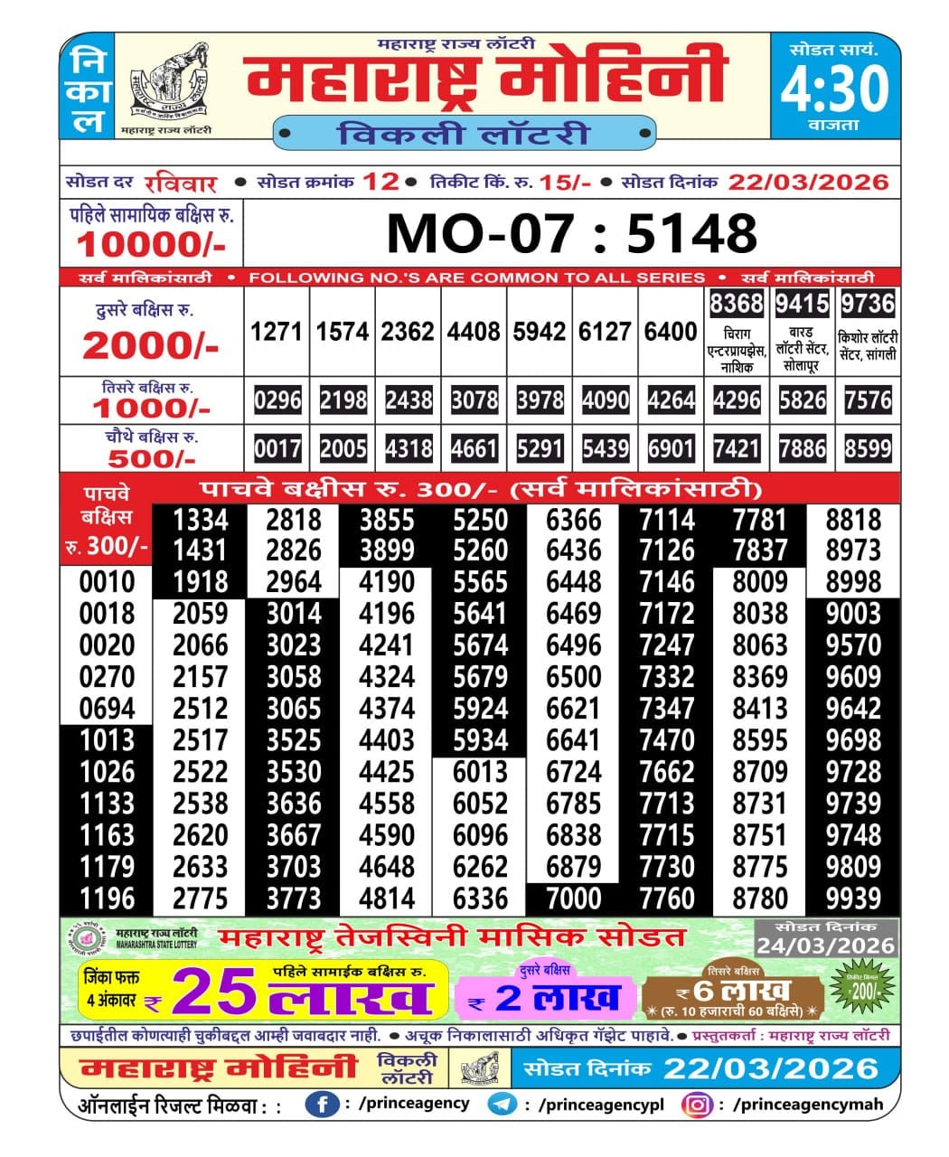 Maharashtralaxmi Weekly Draw Result 28.03.2026 0 Likes 36 Views Related Articles 0 161Maharashtra Ganeshlaxmi Vaibhav Weekly Draw 23.11.2025 Result 5pm 20 210Punjab State Dear 50 Jackal Saturday 6pm Lottery Result 03.01.2026 0 66Maharashtra Ganeshlaxmi Bhagyashali Weekly Draw 19.01.2026 Result 5pm 0 122Maharashtra Ganeshlaxmi Bhagyashali Weekly Draw 24.11.2025 Result 5pm
