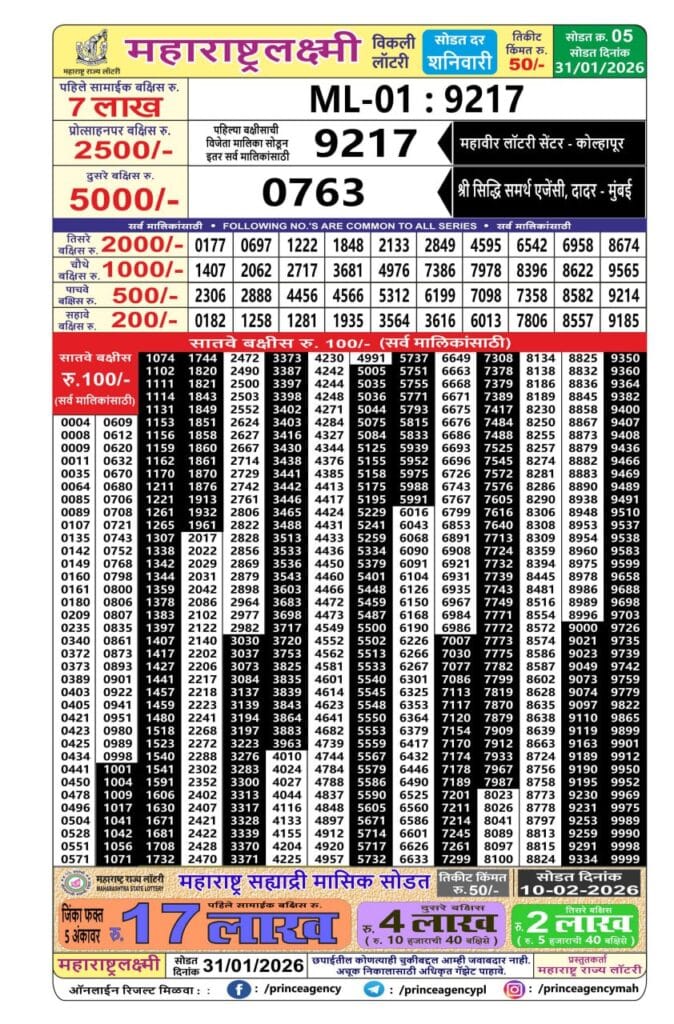 Maharashtralaxmi Weekly Draw Result 31.01.2026
