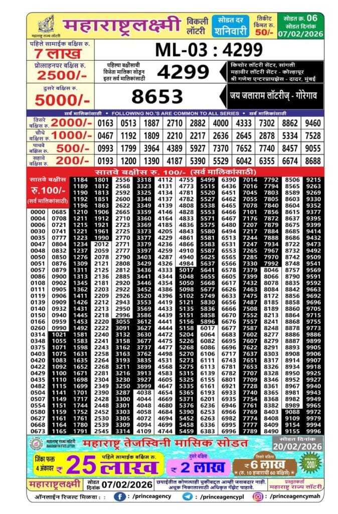 Maharashtralaxmi Weekly Draw Result 7.2.2026 0 Likes 73 Views Related Articles 23 370Punjab state dear lohri makar sankranti bumper 17.1.2026 at 6pm 0 103Maharashtra Ganeshlaxmi Vaibhav Weekly Draw 09.11.2025 Result 5pm 0 109Maharashtra Ganeshlaxmi Vijayee Weekly Draw 26.11.2025 Result 5pm 0 48Maharashtra sahyadri monthly lottery 10.2.2026 at 4pm (Icc Under-19 Cricket World Cup 2026 Champions)