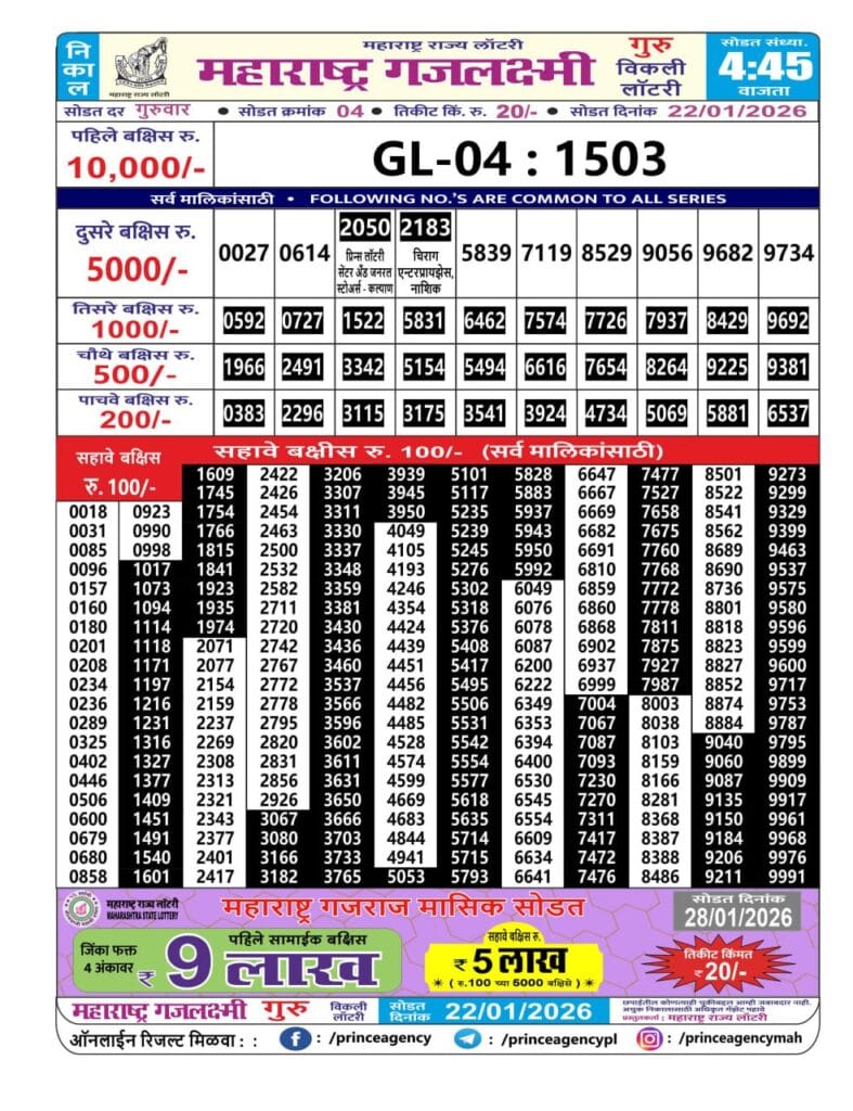 Mh. Gajlaxmi Guru Weekly Draw 22.01.2026 Result 4.45pm 0 Likes 68 Views Related Articles 0 207Maharashtra Akarshak Pushkaraj Weekly Draw Result 27.11.2025 0 109Maharashtra Ganeshlaxmi Bhagyashali Weekly Draw 27.10.2025 Result 5pm 0 56Maharashtra Sahyadri Dhanlaxmi Weekly Draw 12.01.2026 Result 4.30pm 0 115Nagaland State Dear 2000 Monthly Lottery 9.8.2025 Result 8PM