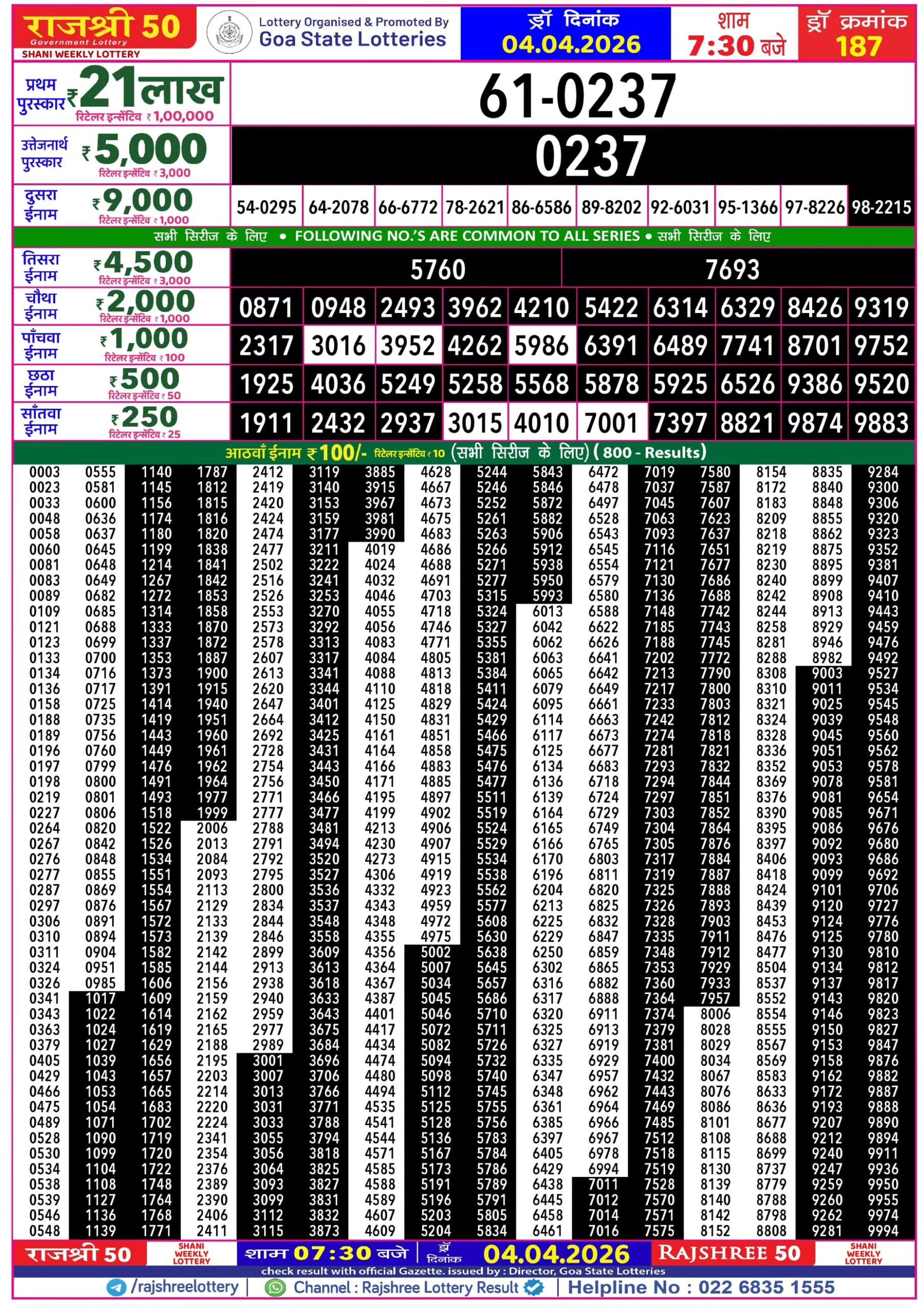 Maharashtra Mohini Weekly Draw 15.03.2026 Result 4.30 PM 0 Likes 51 Views Related Articles 0 10Rajshree 50 Shani Weekly Lottery 04.04.2026 Result 7.30 PM 0 38Rajshree Saturday Weekly Lottery 28.03.2026 Result 8 PM 0 80Golden Star Shukra Weekly Lottery 13.02.2026 Result 7 PM 0 209Rajshree 250 monthly lottery 3.2.2026 at 6.30pm