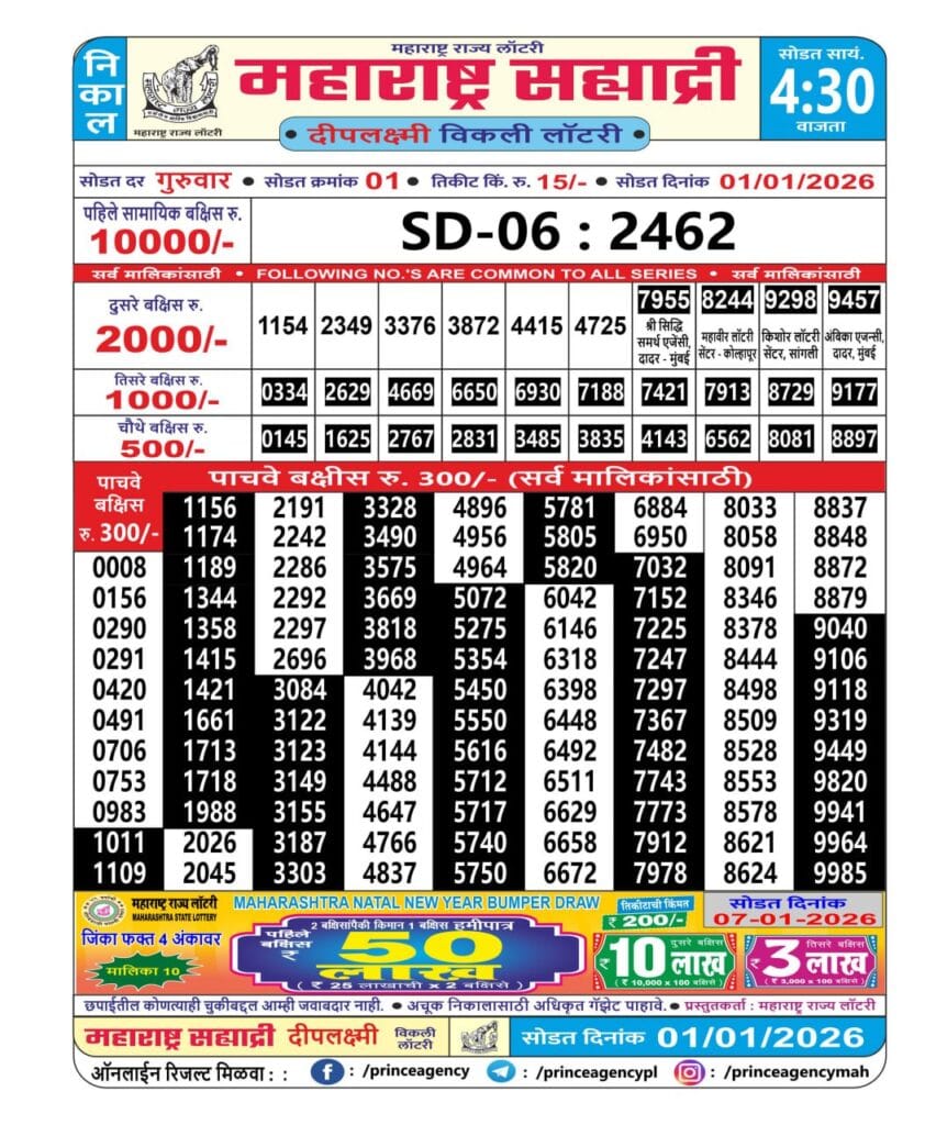 Maharashtra Sahyadri Deeplaxmi Weekly Draw 01.01.2026 Result 4.30 PM 0 Likes 140 Views Related Articles 0 67Rajshree Thursday Weekly Lottery 26.03.2026 Result 8 PM 0 42Rajshree 10 Evening Som Weekly Lottery 02.03.2026 Result 5.40 PM 0 42Punjab State Dear 200 Monthly Lottery 4 April 2026 At 6 PM 0 58Punjab State Dear 50 Buster Wednesday Weekly Lottery 4.2.2026 Result 5 PM