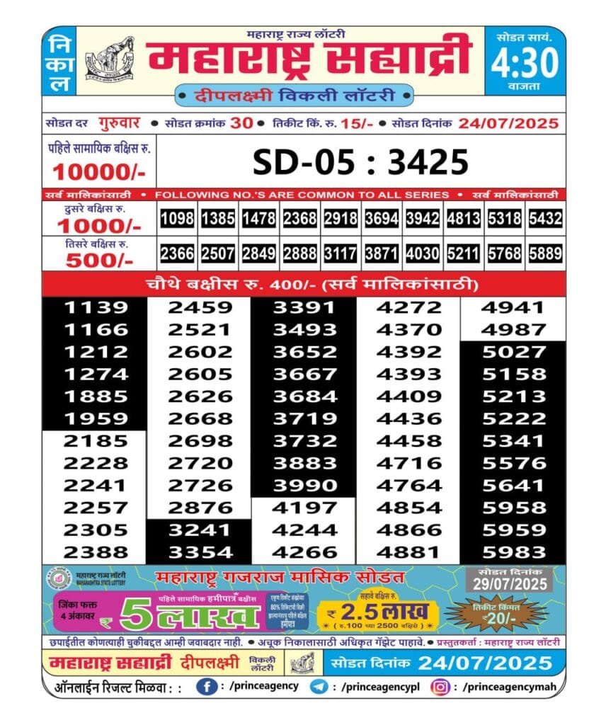 Mh. Sahyadri Deeplaxmi Weekly Draw 24.07.2025 Result 4.30pm 0 Likes 66 Views Related Articles 0 57Maharashtra Ganeshlaxmi Bhagyashali Weekly Draw 27.10.2025 Result 5pm 0 62Punjab State Dear 50 Beast Monday 6pm Lottery Result 15.09.2025 0 55Rajshree 30 Lottery 8:30PM Result 21.07.2025 0 59Maharashtra Ganeshlaxmi Bhagyashali Weekly Draw 24.11.2025 Result 5pm