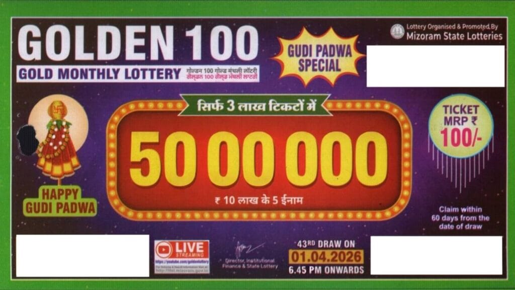 Mizoram State Golden 100 Gold Monthly Lottery 43rd Draw On Wednesday, 1 April 2026 At 6:30 PM. You can watch result on our website lotteryresultsnow.in