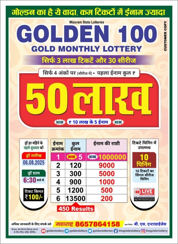 Mizoram State Golden 100 Gold Monthly Lottery 6 August 2025 At 6.30 PM