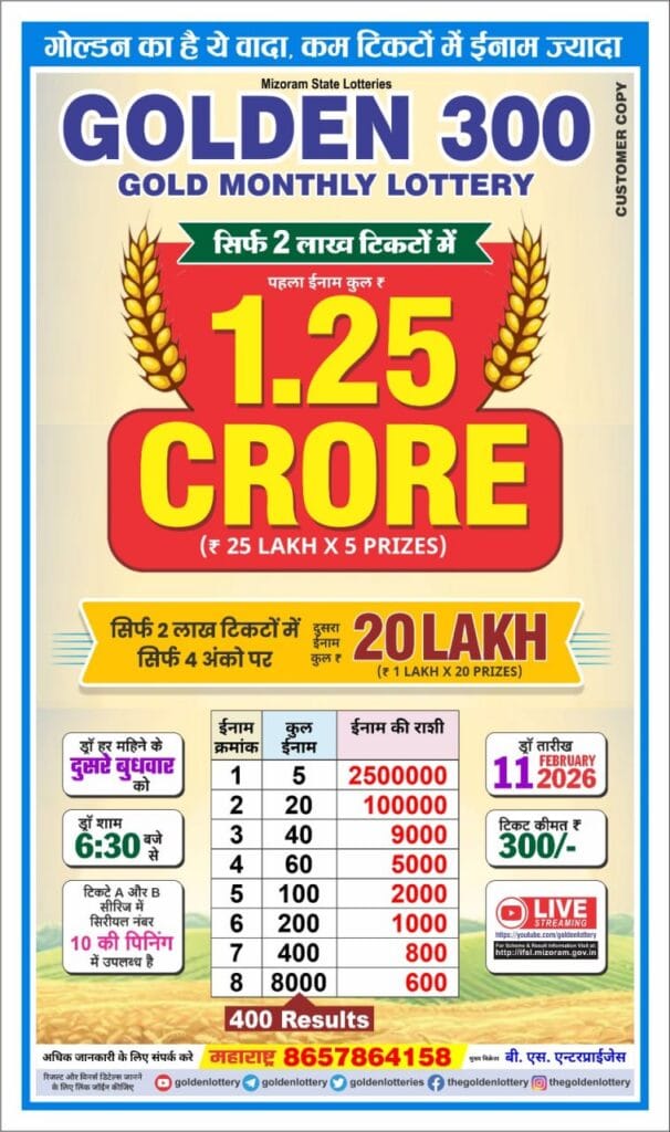 Mizoram State Golden 300 Gold Monthly Lottery Draw On Wednesday, 11 Febraury 2026 At 6.30 PM. You can watch result on our site lotteryresultsnow.in