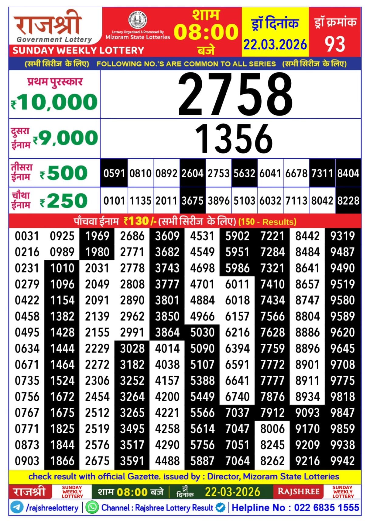 Rajshree Sunday Weekly Lottery 22.03.2026 Result 8 PM