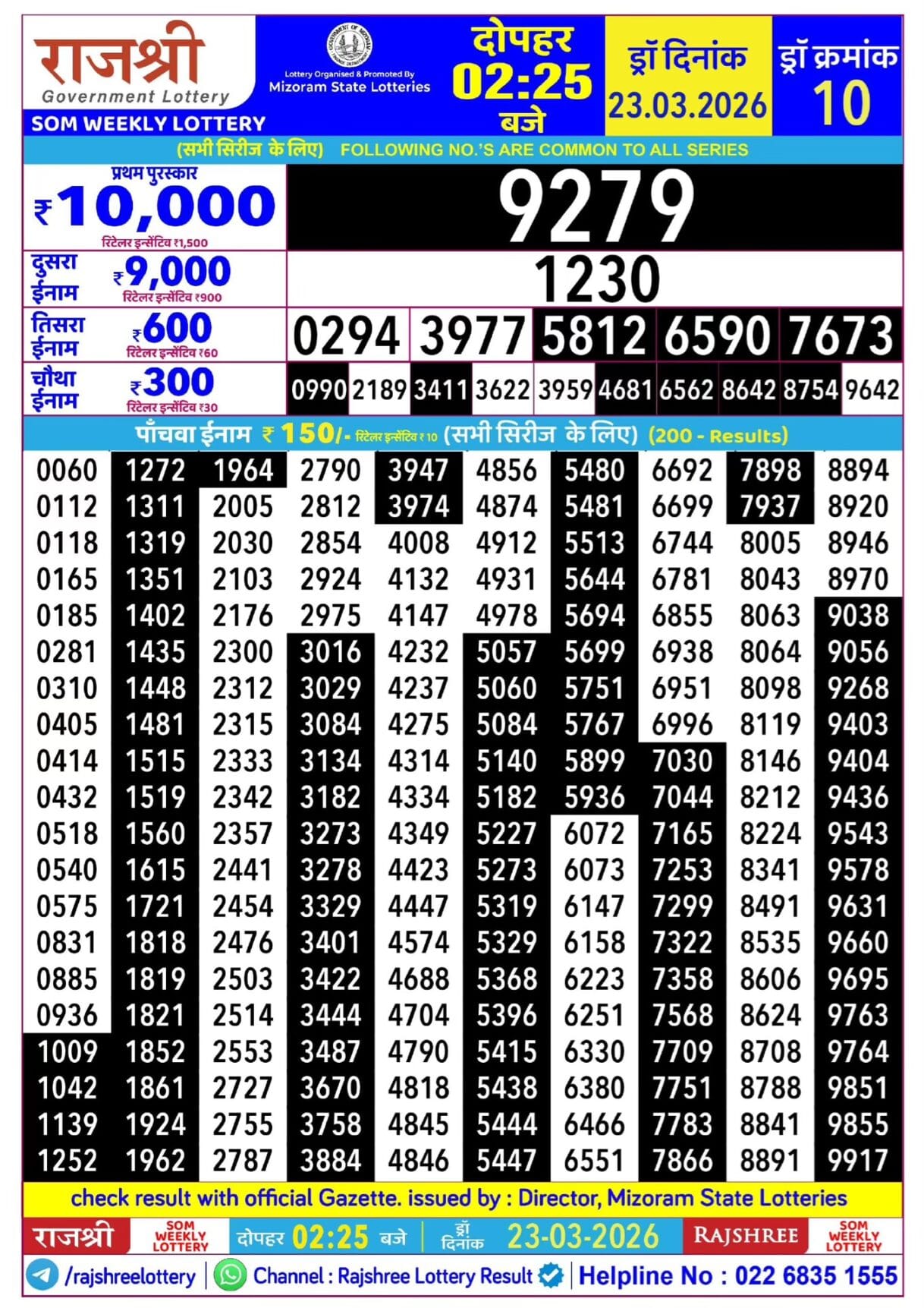 Rajshree Som Weekly Lottery 23.03.2026 Result 2.25 PM