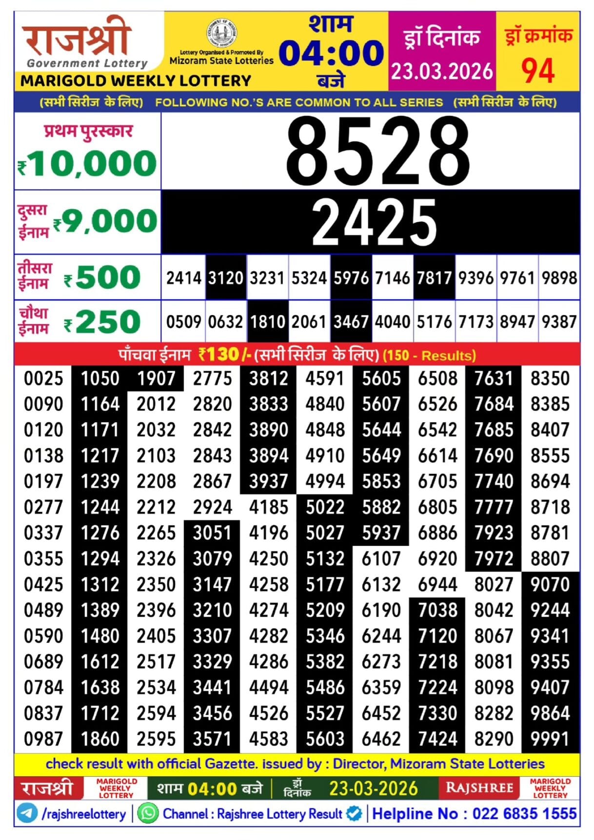 Rajshree Marigold Weekly Lottery 23.03.2026 Result 4 PM